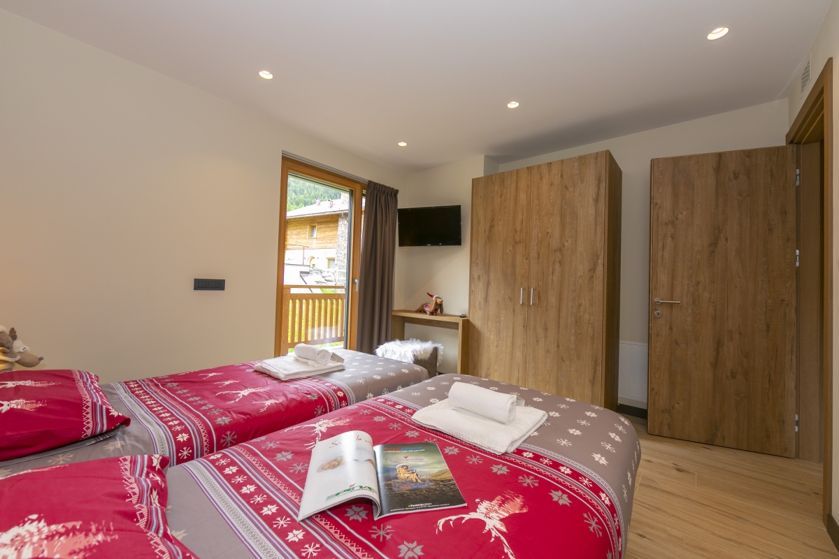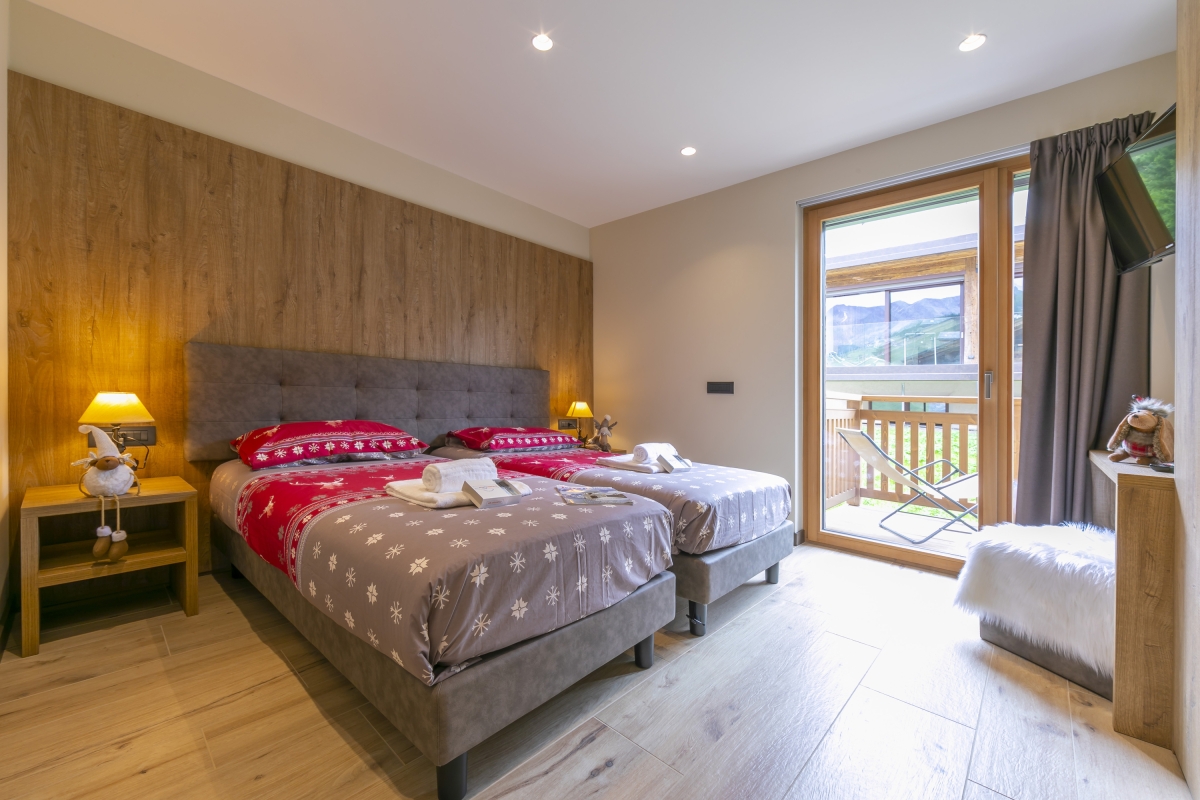 Bedroom 1: The delightfully modern bedroom with terrace access has large glass panes overlooking the outside world. It is furnished with a pair of joinable single beds, a wall-mounted TV and a wardrobe.