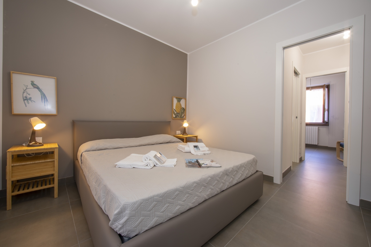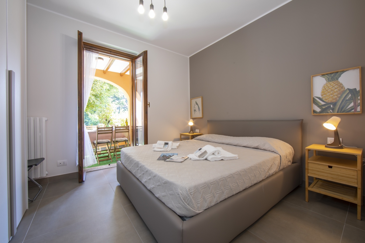 Bedroom 1: The modern bedroom offers access to the terrace and has a double bed and a wardrobe.