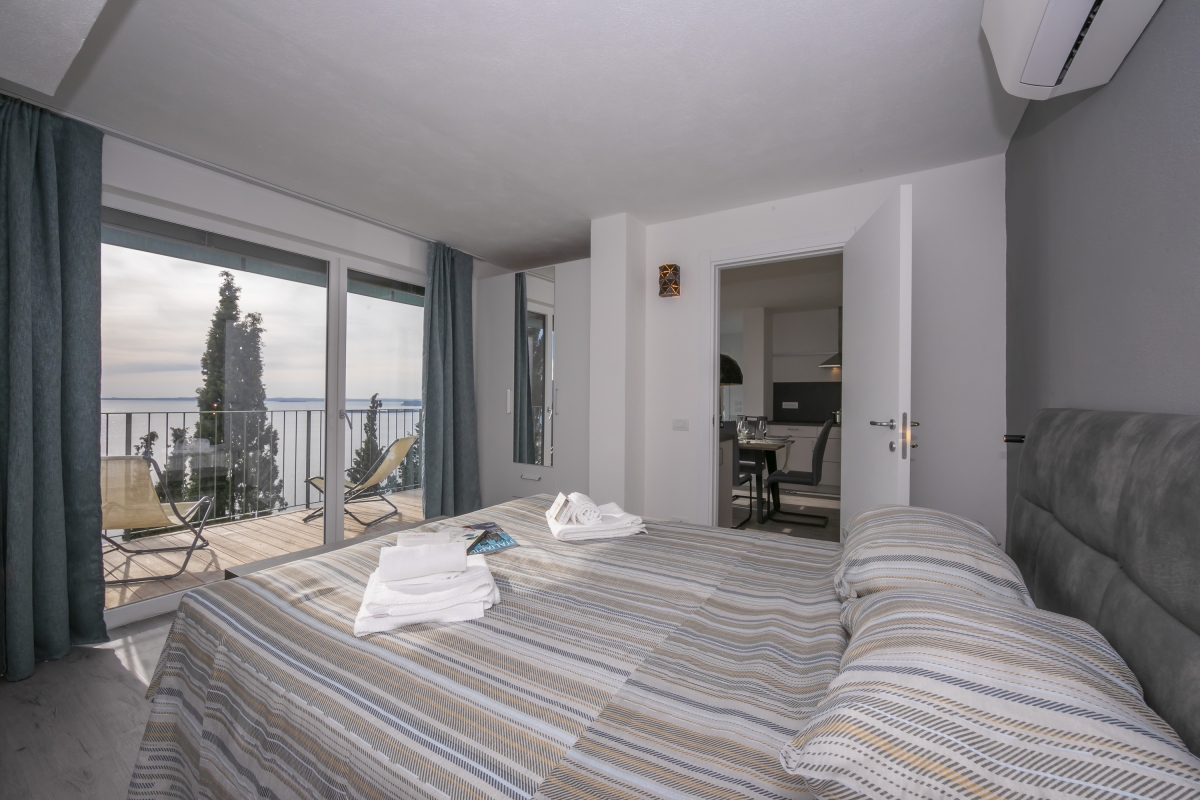 Bedroom 1: The modern bedroom with balcony access offering incredible lake views has a double bed.