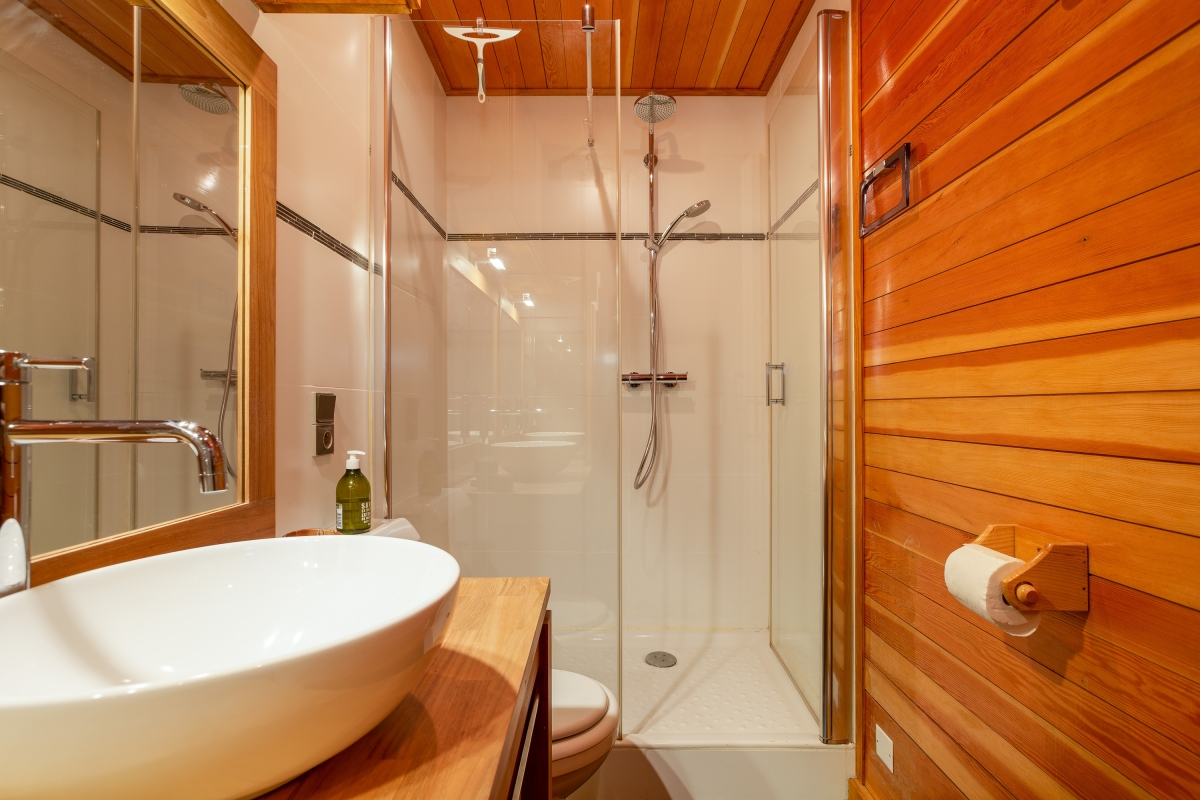 Bathroom 1: A spacious walk-in shower, wash basin & WC.