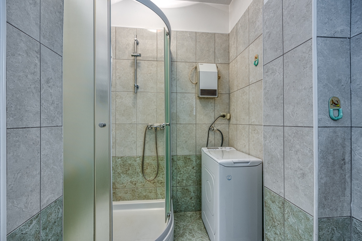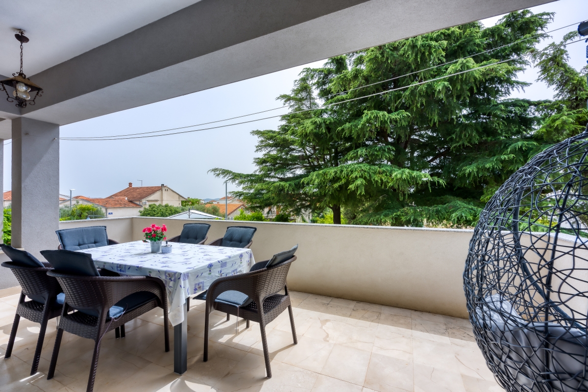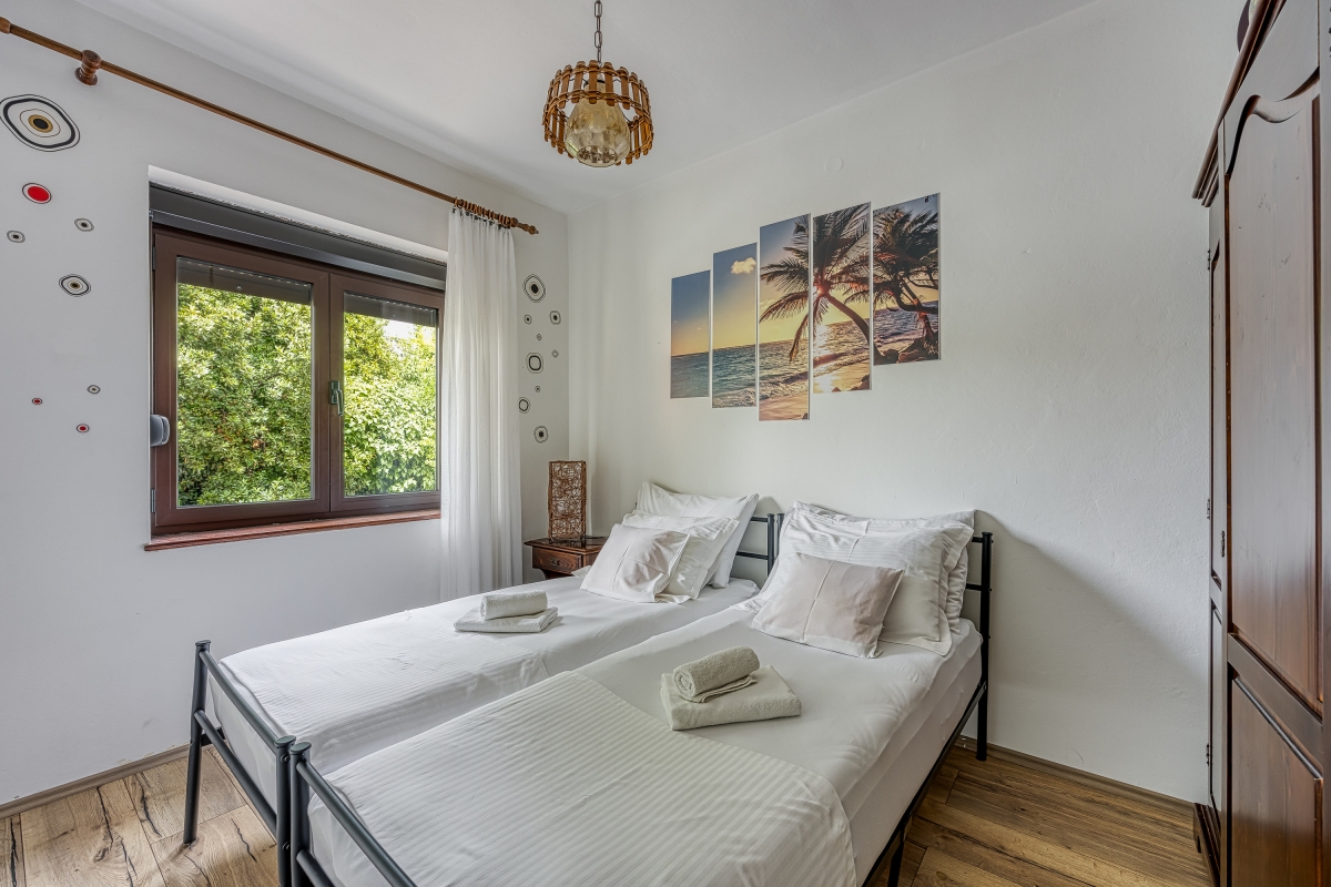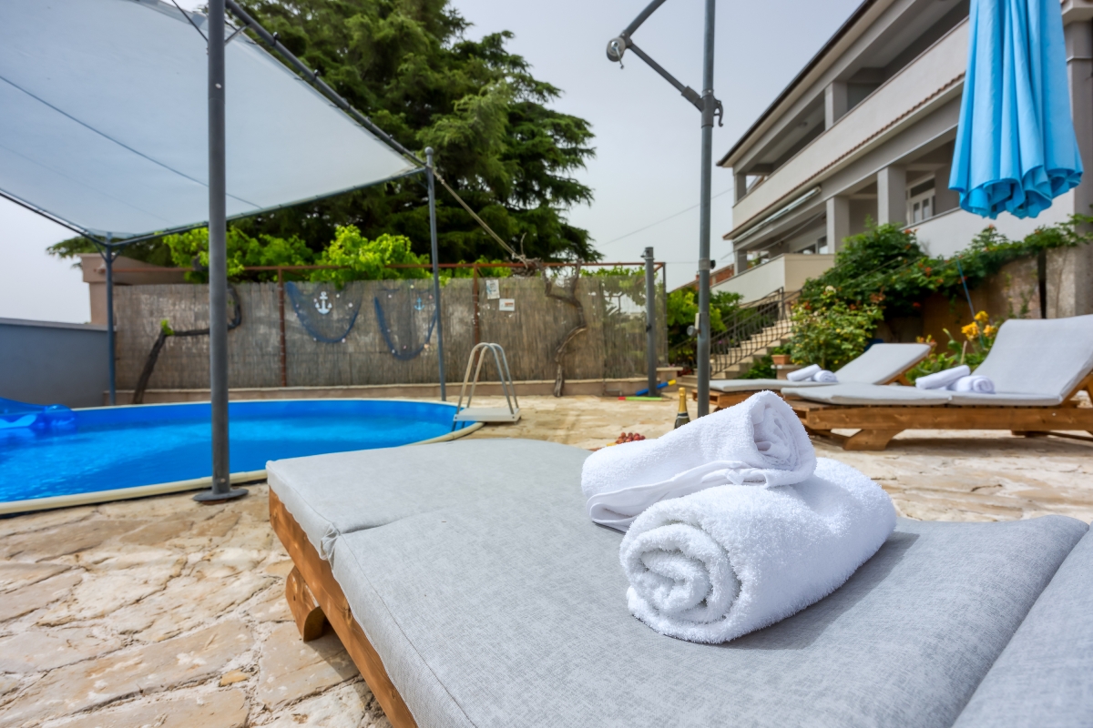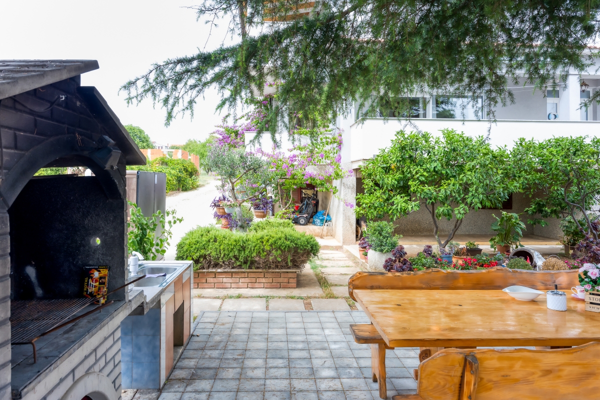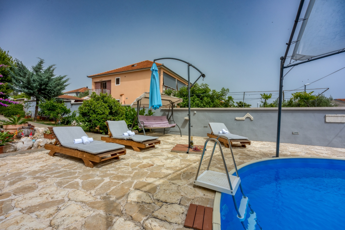 The sunny apartment features a stylish circular pool, a relaxing area with parasols and a private garden. The outdoor pool (unheated) is shared only with the other apartment. The holiday retreat offers a comfortable and pleasant stay experience just 300 meters from the beach. Guests can dine out on the balcony while enjoying the sun during the summer season and Pakoštane’s mild climate during the rest of the year. The terrace is equipped with loungers and a canopy porch swing.