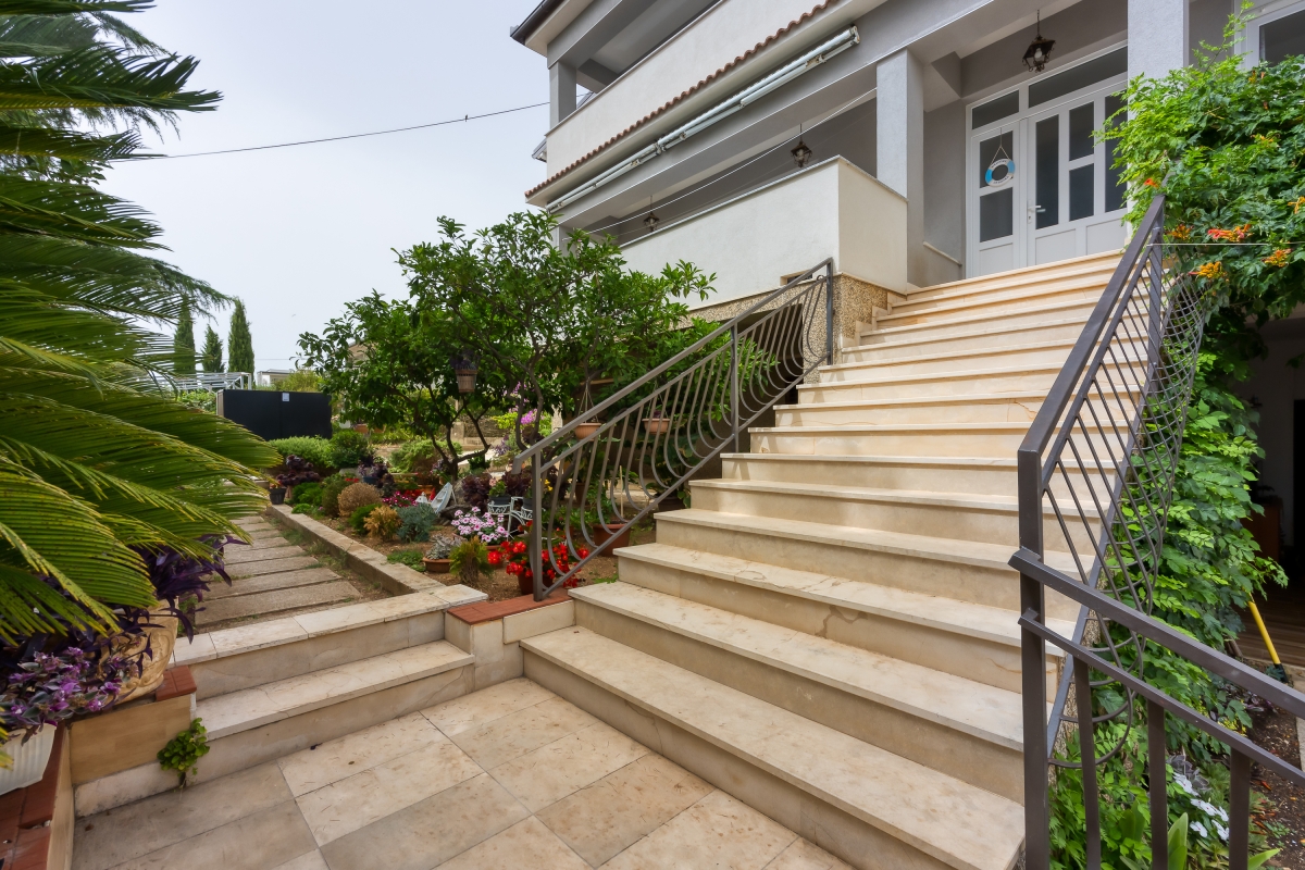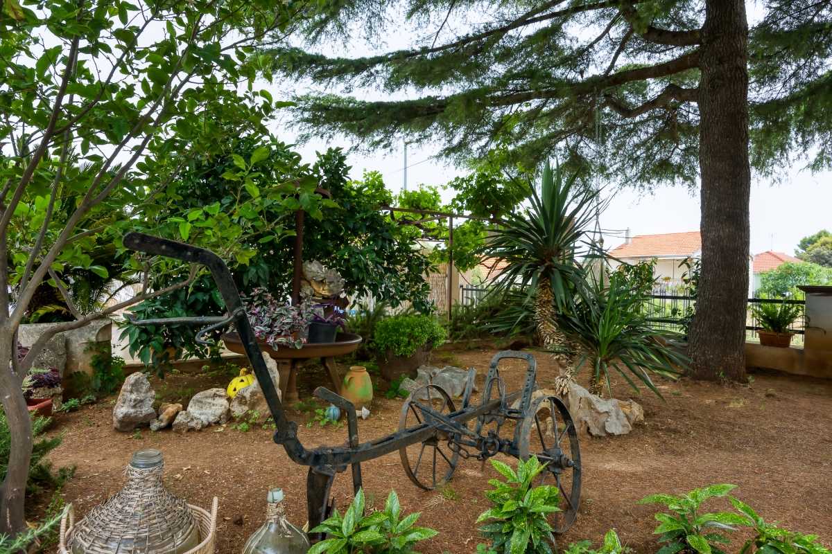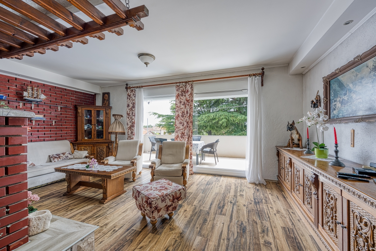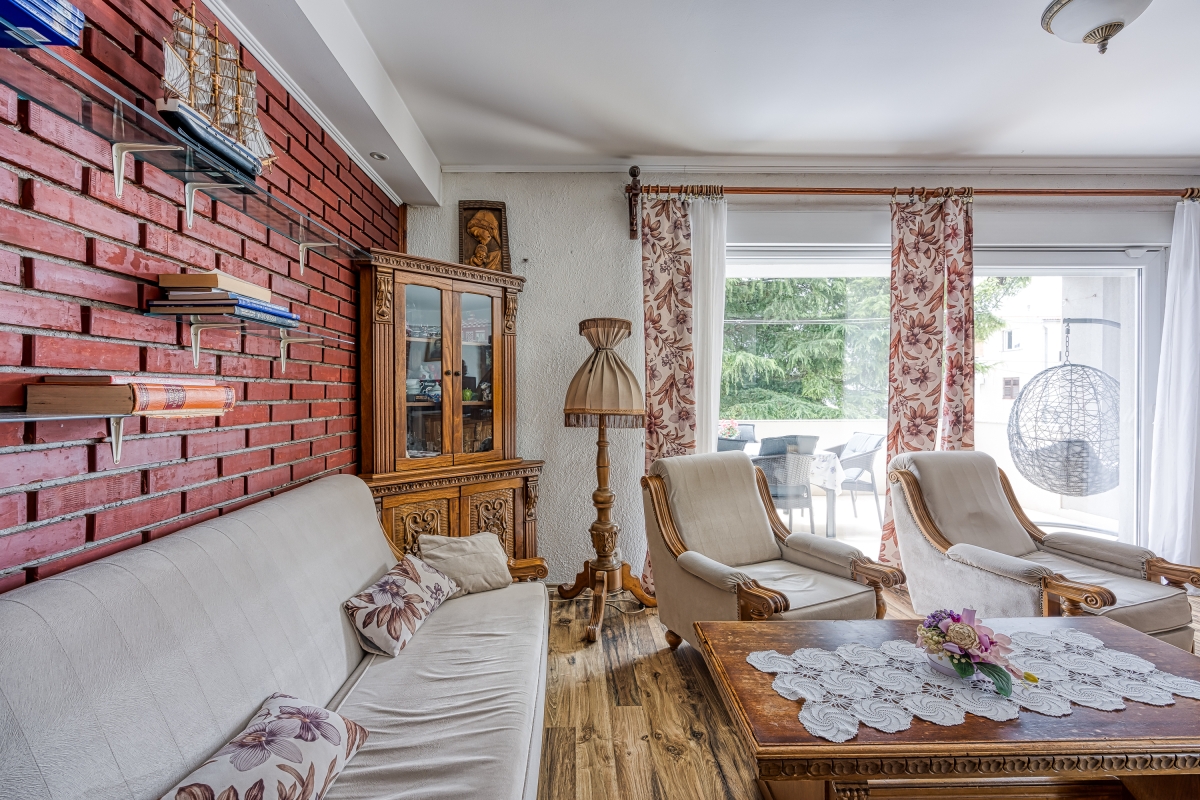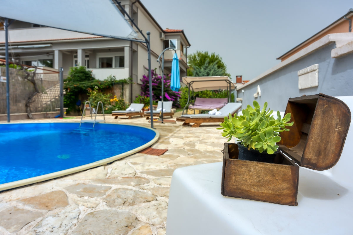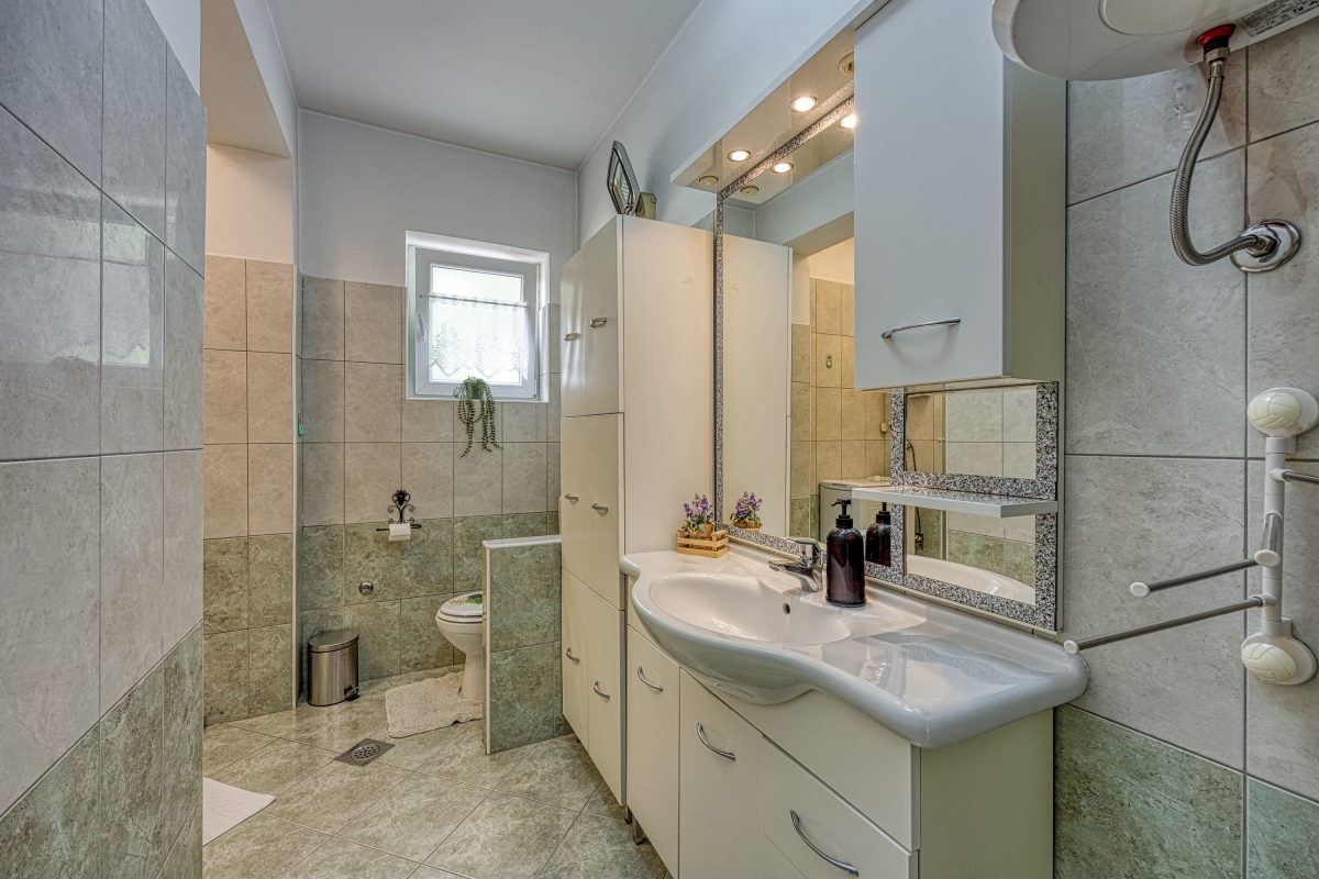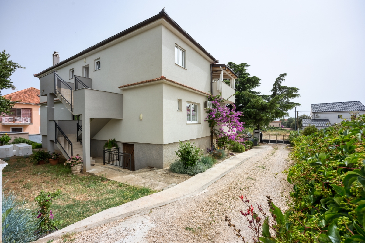 The sunny apartment features a stylish circular pool, a relaxing area with parasols and a private garden. The outdoor pool (unheated) is shared only with the other apartment. The holiday retreat offers a comfortable and pleasant stay experience just 300 meters from the beach. Guests can dine out on the balcony while enjoying the sun during the summer season and Pakoštane’s mild climate during the rest of the year. The terrace is equipped with loungers and a canopy porch swing.