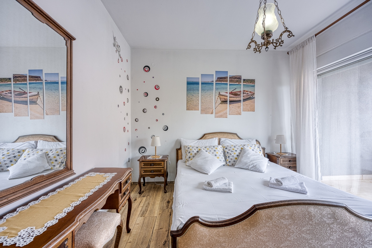 Bedroom 2: The elegant room with access to the balcony is furnished with a double bed and a wardrobe.