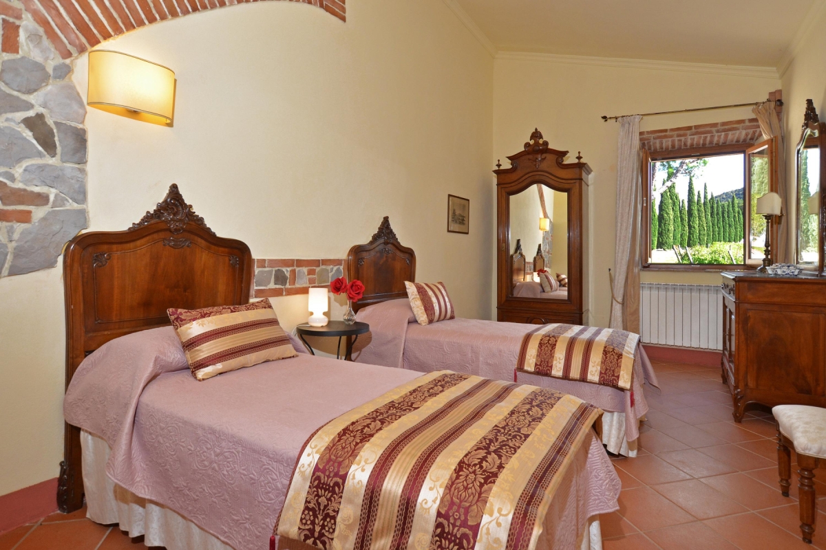 Bedroom 6: This bedroom has partially retained stone walls which give it a unique rustic look. It is furnished with a pair of single beds and an attached bathroom. Its window overlooks rows of Italian cypresses.