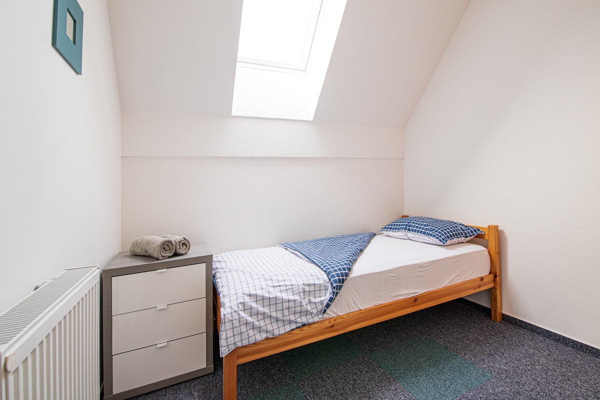 Bedroom 2: The cozy room under the sloped ceiling has a single bed.