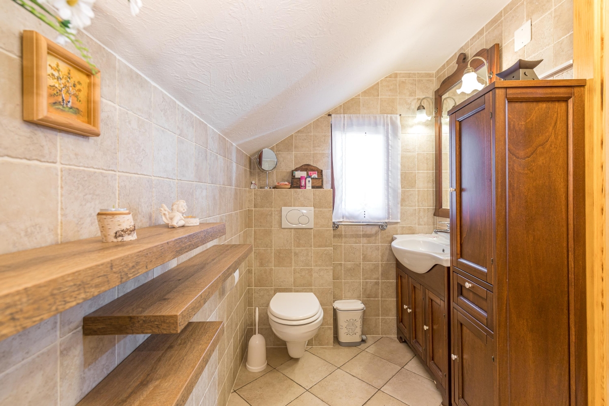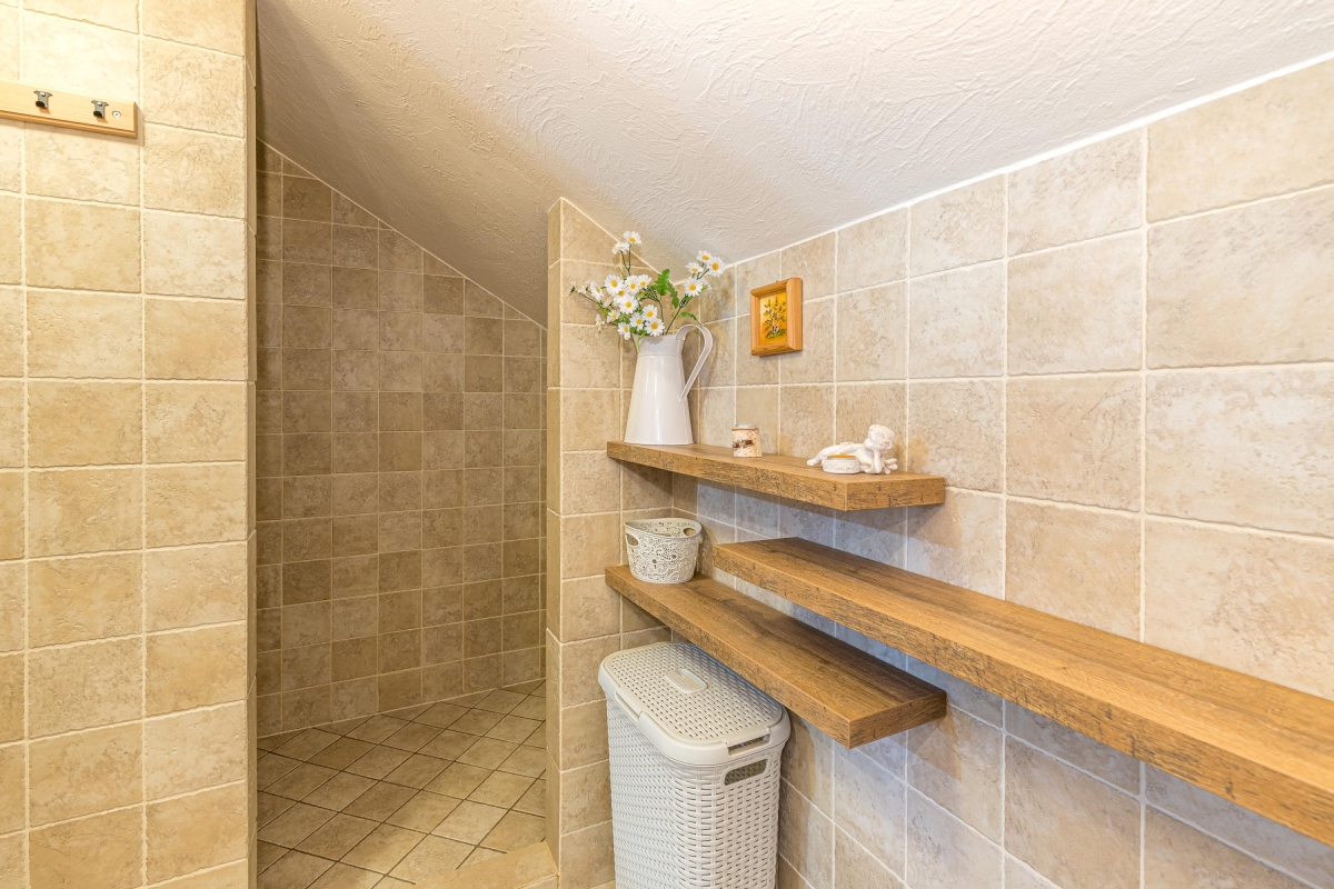 Bathroom 1: The bathroom is keeping in with the general style of the house. It has a shower and a WC.