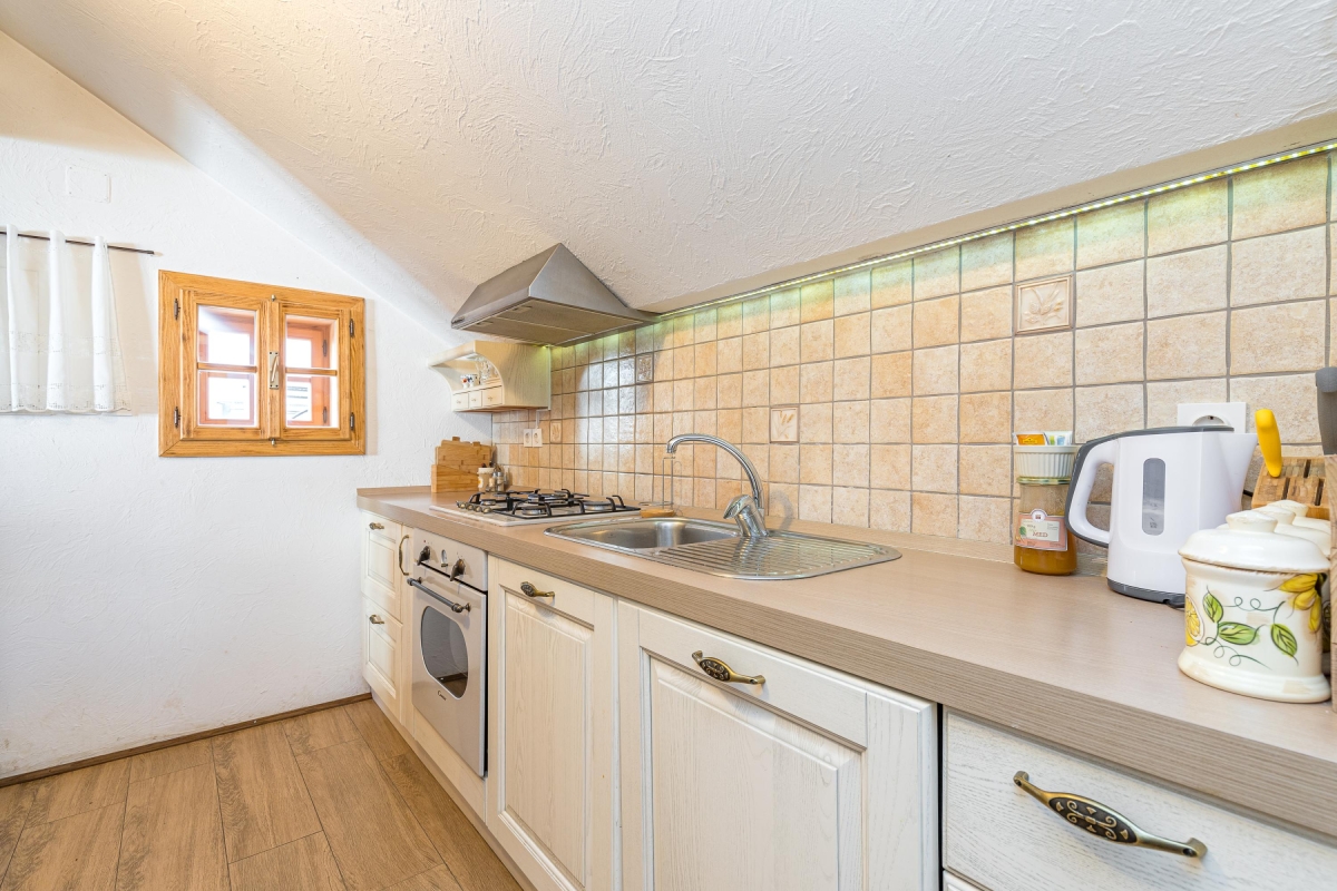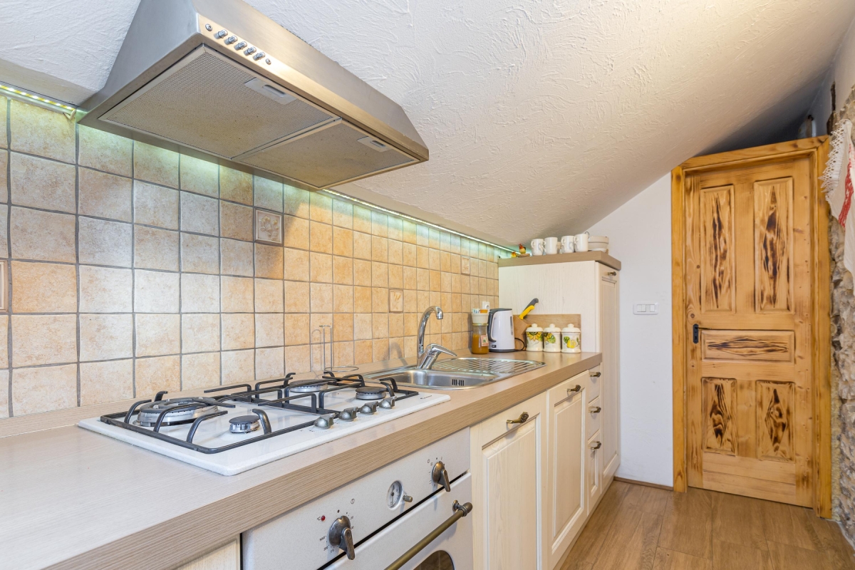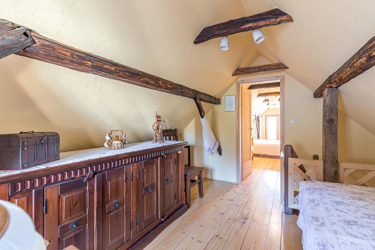 The indoor kitchen is equipped with dishwashing facility, an american style coffee machine, an oven, a toaster, a cooker hob, an electric kettle and a fridge with a freezer. There is also an outdoor kitchen in front of the granary and attached to the terrace with a bread oven where guests can bake bread and various meats. From the living area, a steep wooden staircase takes on to the attic level where there are two bedrooms.