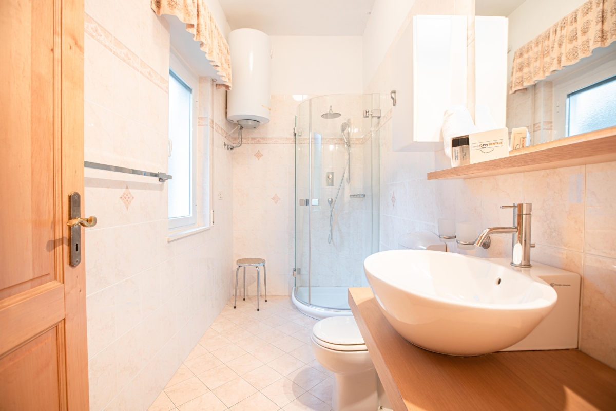 Bathroom 1: The modern bathroom has a washbasin, a shower cubicle and a WC.