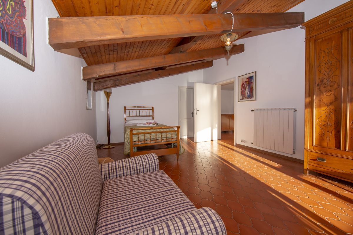 Bedroom 2: The lovely room with a wooden ceiling has a sofa single bed, single bed, an armchair and a breakfast table on its private terrace