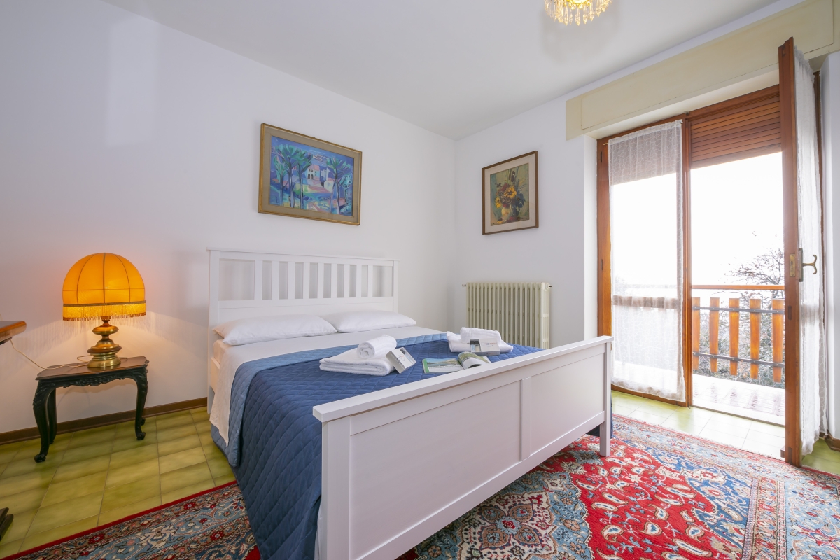 Bedroom 3: The nice bedroom with lake view and balcony access is furnished with two single beds and a wardrobe.