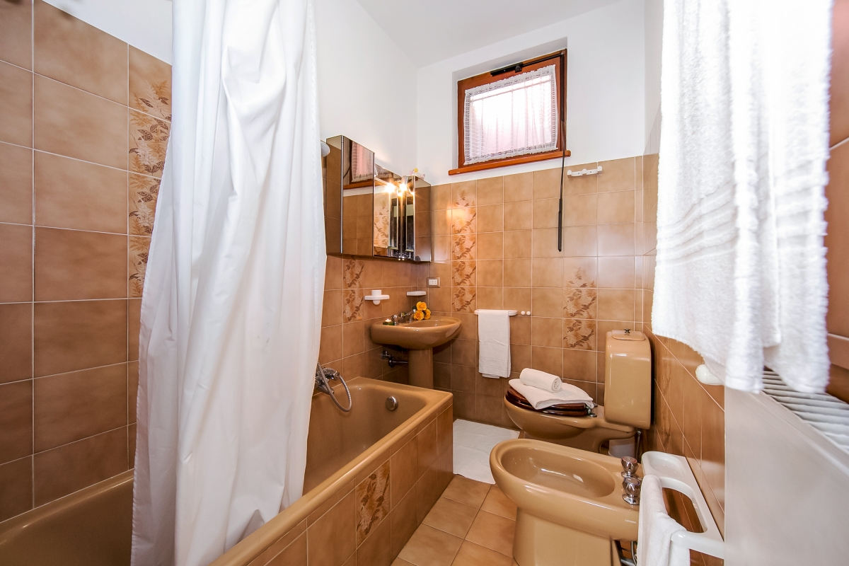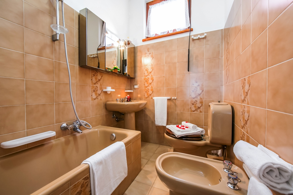 The apartment features a retro-style Bathroom with bath tub, shower tap, wash basin, WC and bidet.