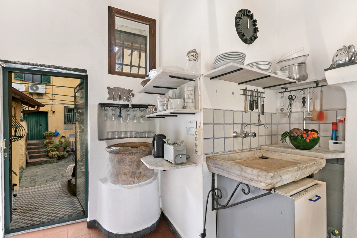 The kitchen is also on the top floor and it is here where guests can appreciate the original features of the house, including a marble sink and large chimney breast. It is equipped with a cooker hob, oven, microwave, dishwasher, fridge, freezer and Mokka coffee machine.