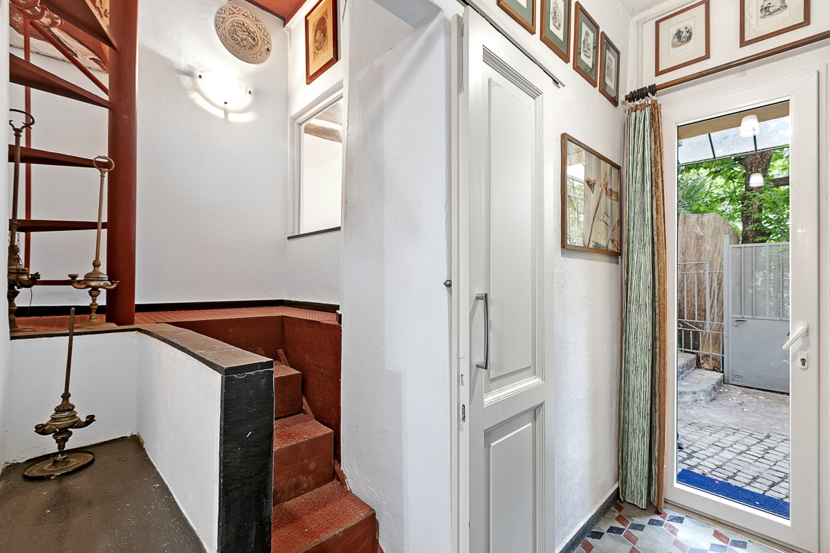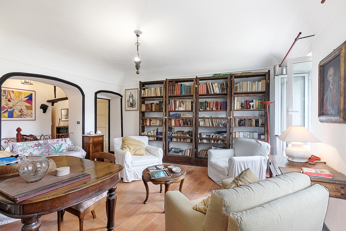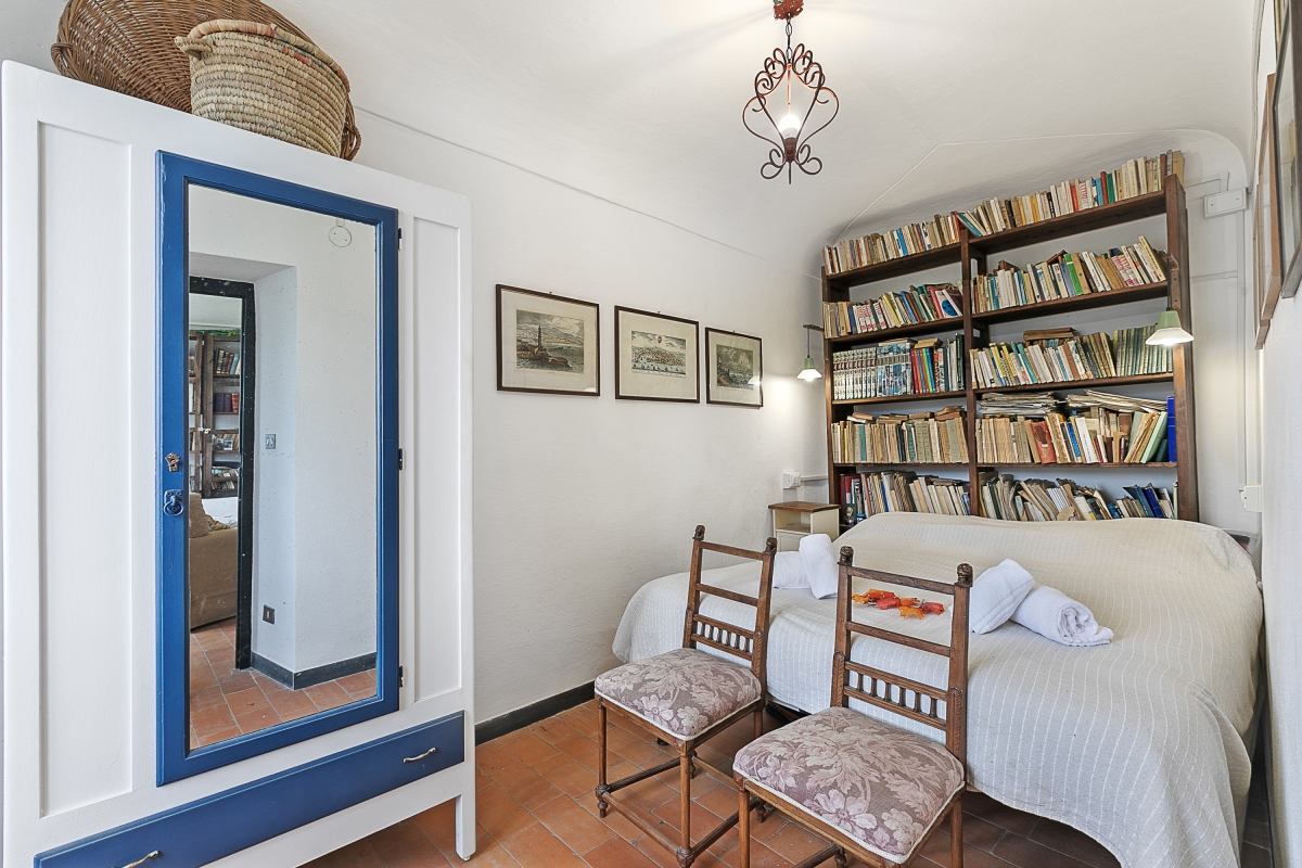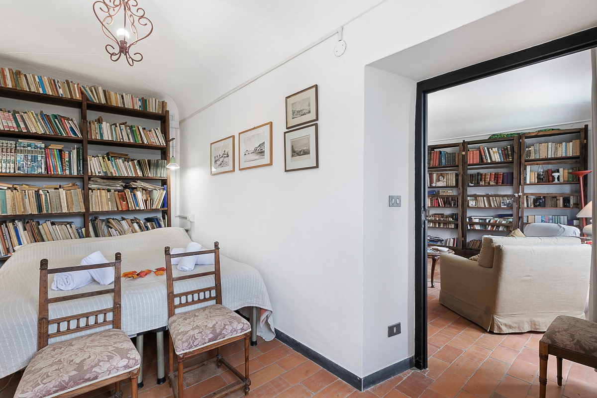 The first entrance, on the top floor, is shared with the owners. On this floor, guests will find a large, elegant living room with panoramic views over the valley. The room is tastefully decorated with some lovely antique furniture, including armchairs, a sofa and extensive bookcases, as well as an attractive dining table.