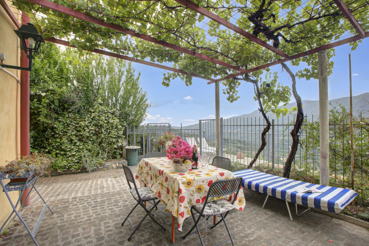 There is a spacious, semi-shaded terrace on this top level, with a table and chairs, where guests can enjoy meals al fresco, with beautiful views out over the valley.
