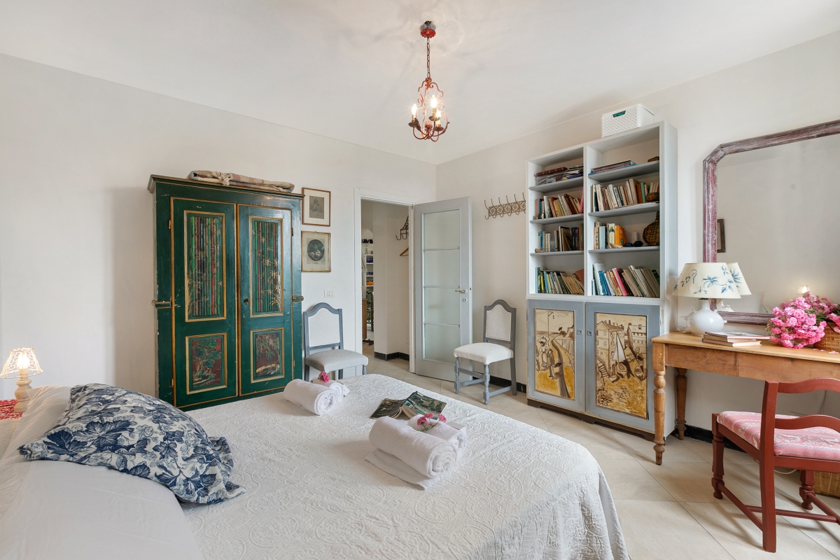 Bedroom 1: The spacious master bedroom is furnished with a double bed, bookcases, a pretty painted wardrobe, and a desk/dressing table.