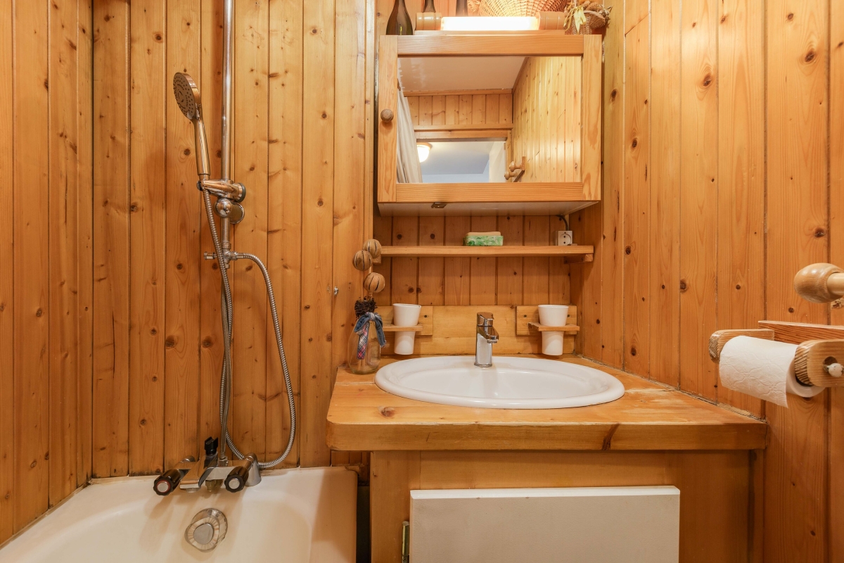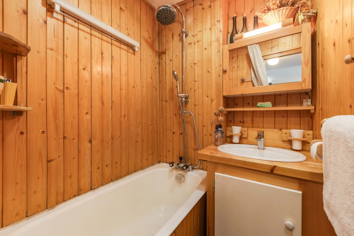 The all-wood bathroom has a bath with a shower and a WC.