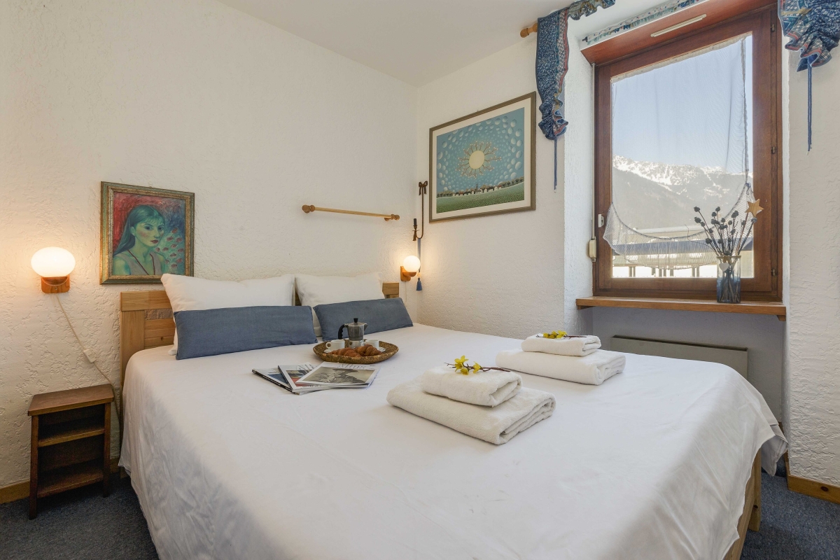 Bedroom 1: The bedroom with a view of La Flégère from its window features a double bed and a wardrobe.