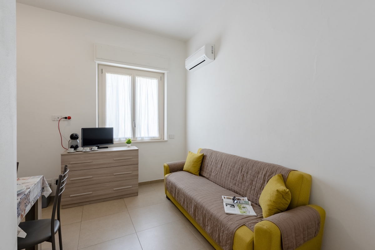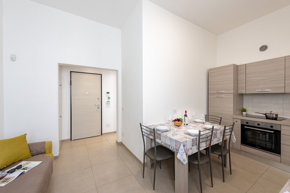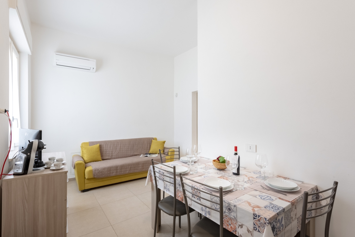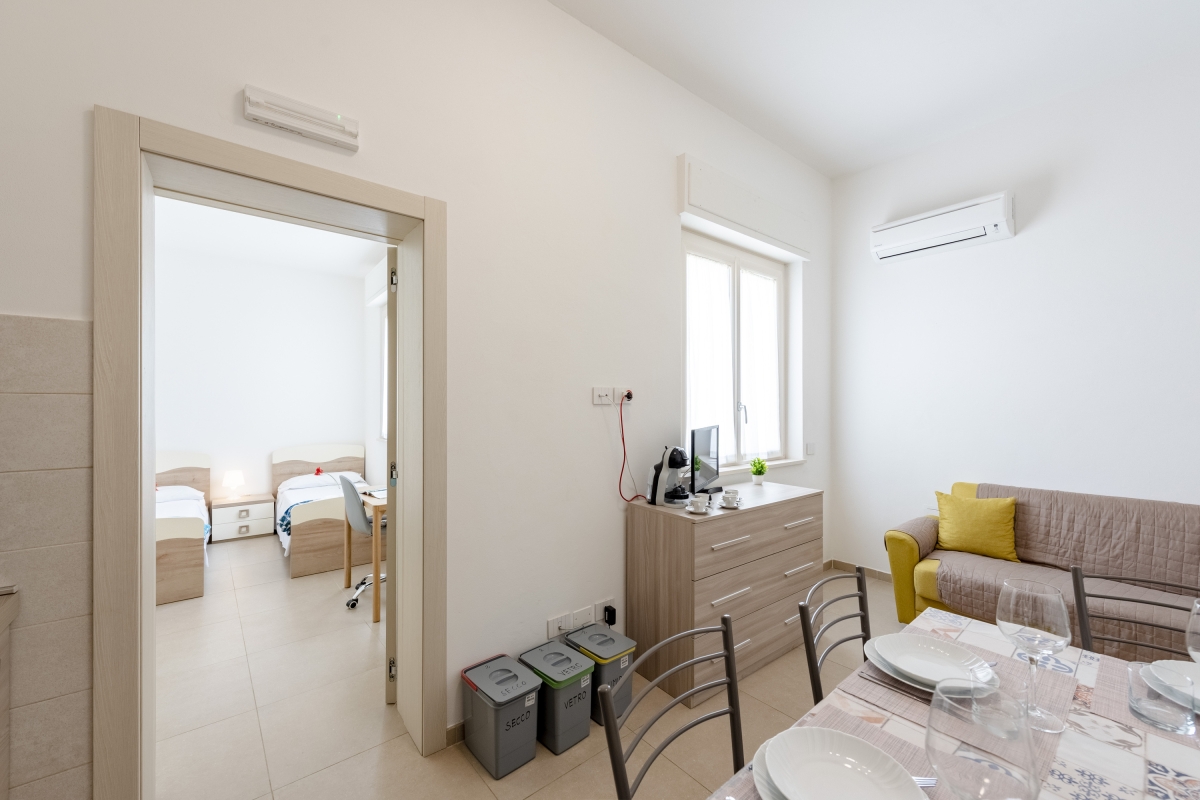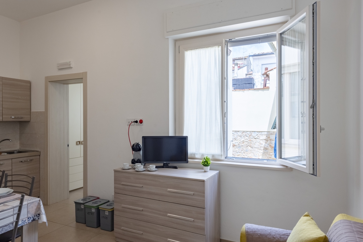 The newly furnished apartment with a balcony is located on the first floor and is furnished for a comfortable stay. It can accommodate up to 5 guests. The open-plan living room has a single sofa bed, a dining table and a kitchen that is equipped with a Dolcegusto coffee machine, an oven and a fridge.
