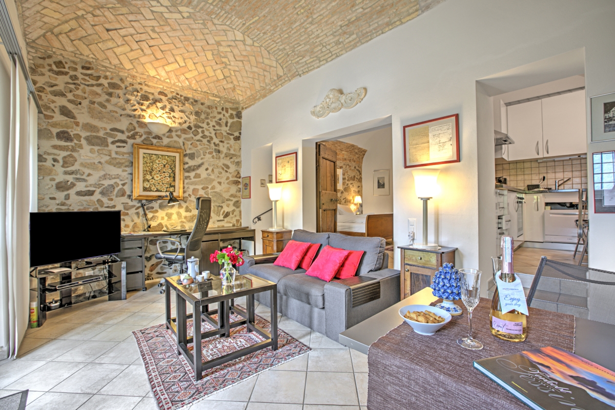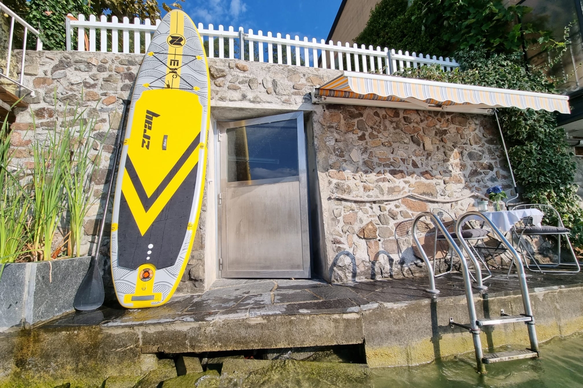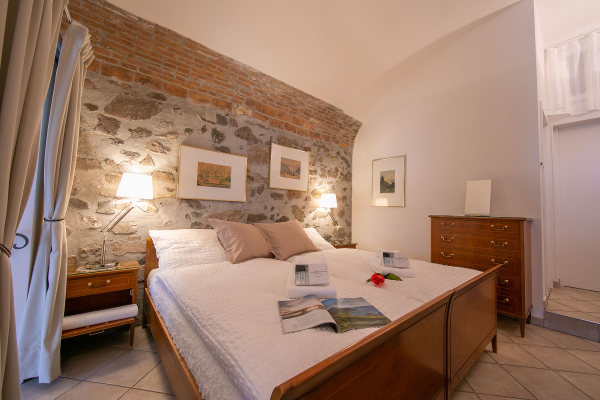 The ground-floor holiday home with a shared garden (only above neighbour has access to it) is a perfect choice of accommodation for a group of friends or a family. It has a distinct architecture involving stone walls that offer a unique staying experience. Guests can eat out on the pier and enjoy lake views. The living room of the house opens into the garden and welcomes natural freshness and sunlight. It is furnished with a sofa, a good collection of books and a flat-screen TV. The modern kitchen-diner is packed with amenities like a dishwasher, a Nespresso coffee machine, an oven, a fridge and a toaster.