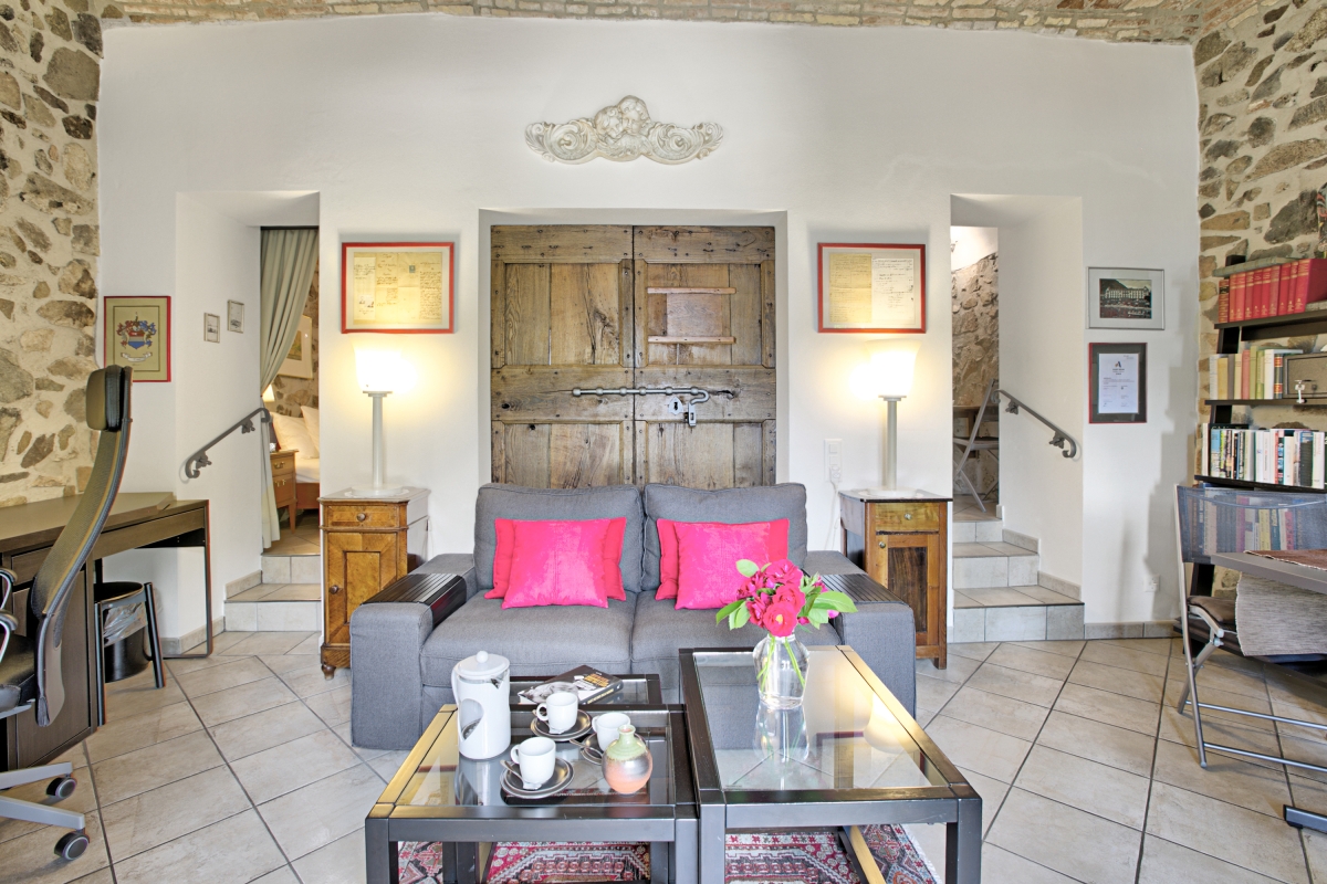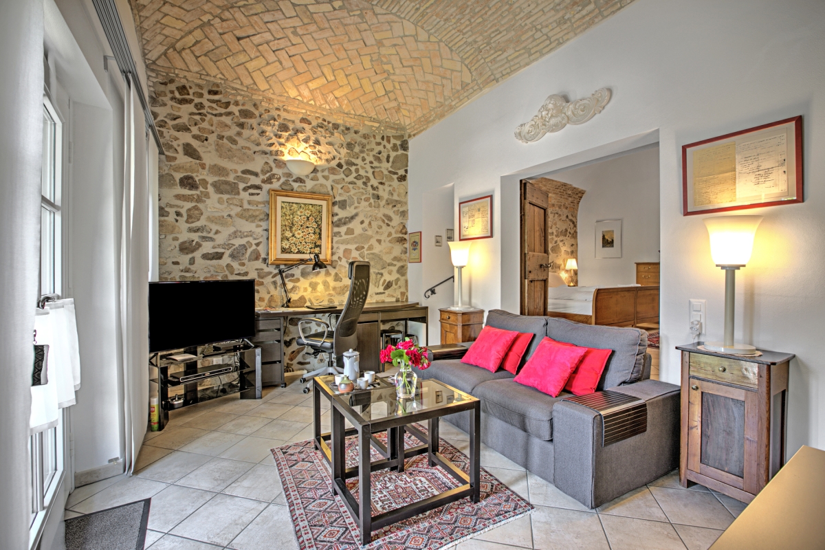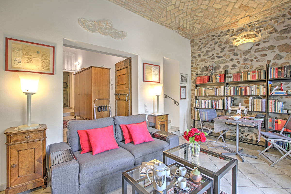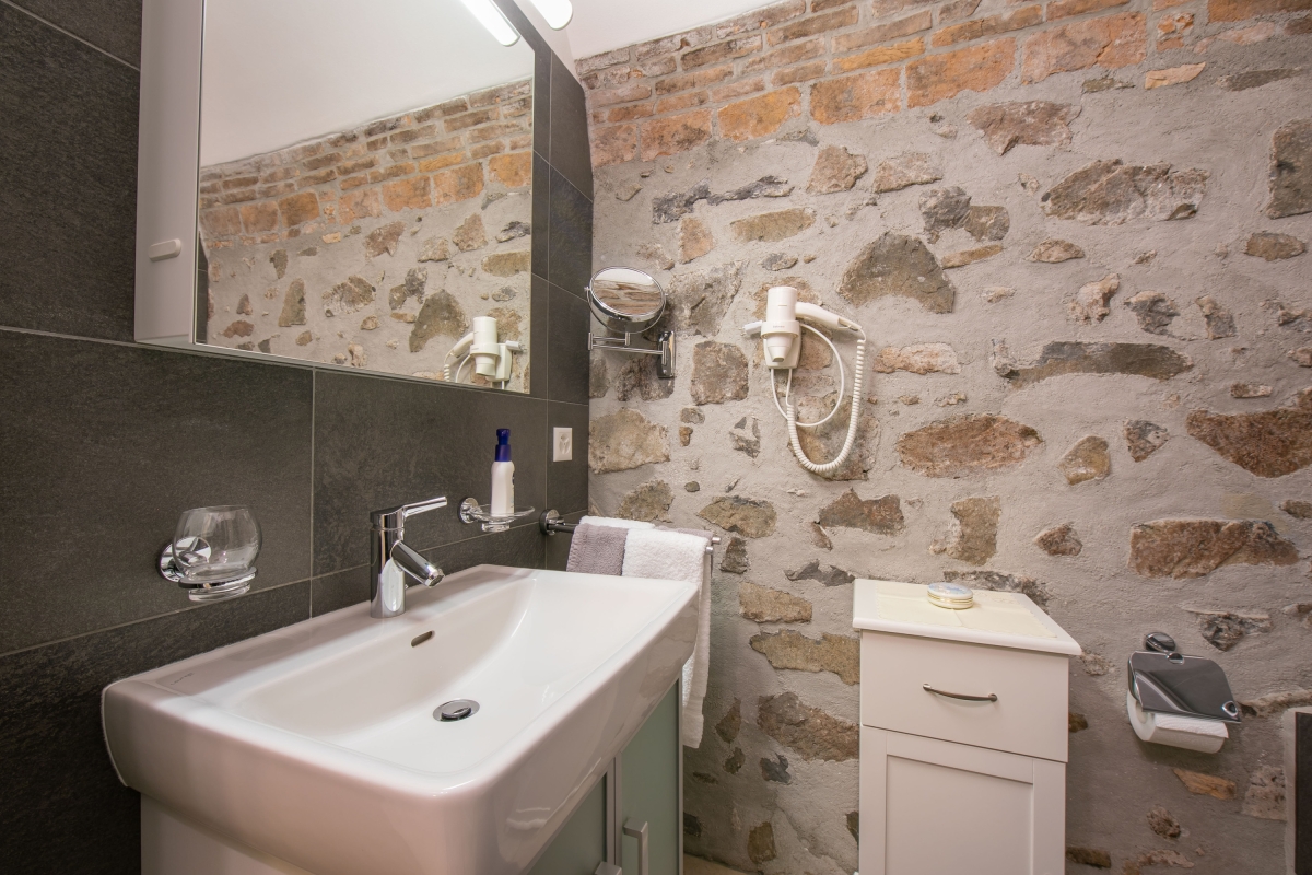 The ground-floor holiday home with a shared garden (only above neighbour has access to it) is a perfect choice of accommodation for a group of friends or a family. It has a distinct architecture involving stone walls that offer a unique staying experience. Guests can eat out on the pier and enjoy lake views. The living room of the house opens into the garden and welcomes natural freshness and sunlight. It is furnished with a sofa, a good collection of books and a flat-screen TV. The modern kitchen-diner is packed with amenities like a dishwasher, a Nespresso coffee machine, an oven, a fridge and a toaster.