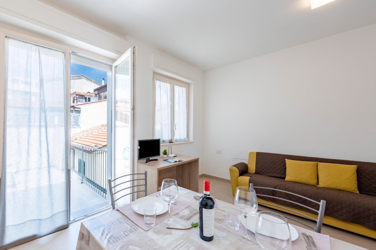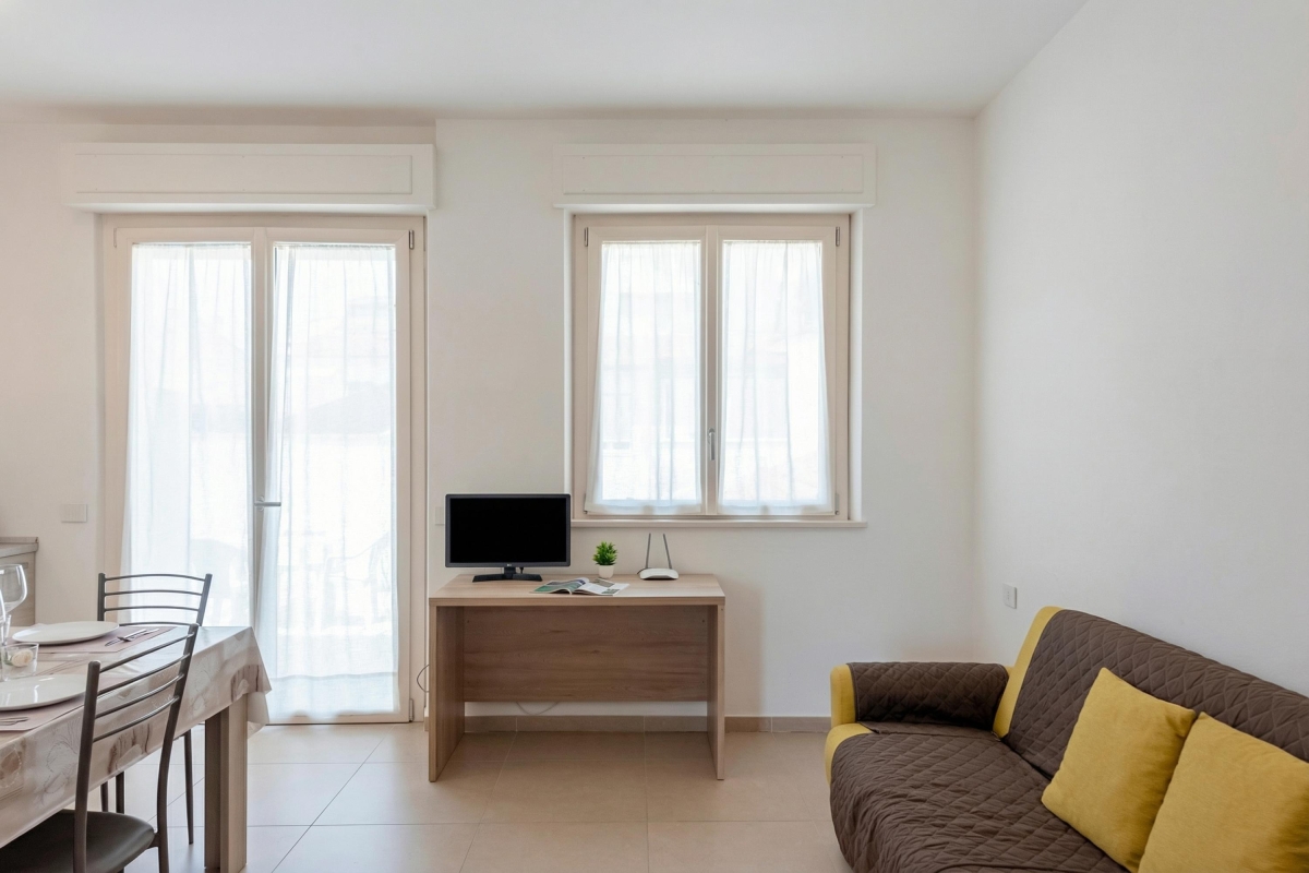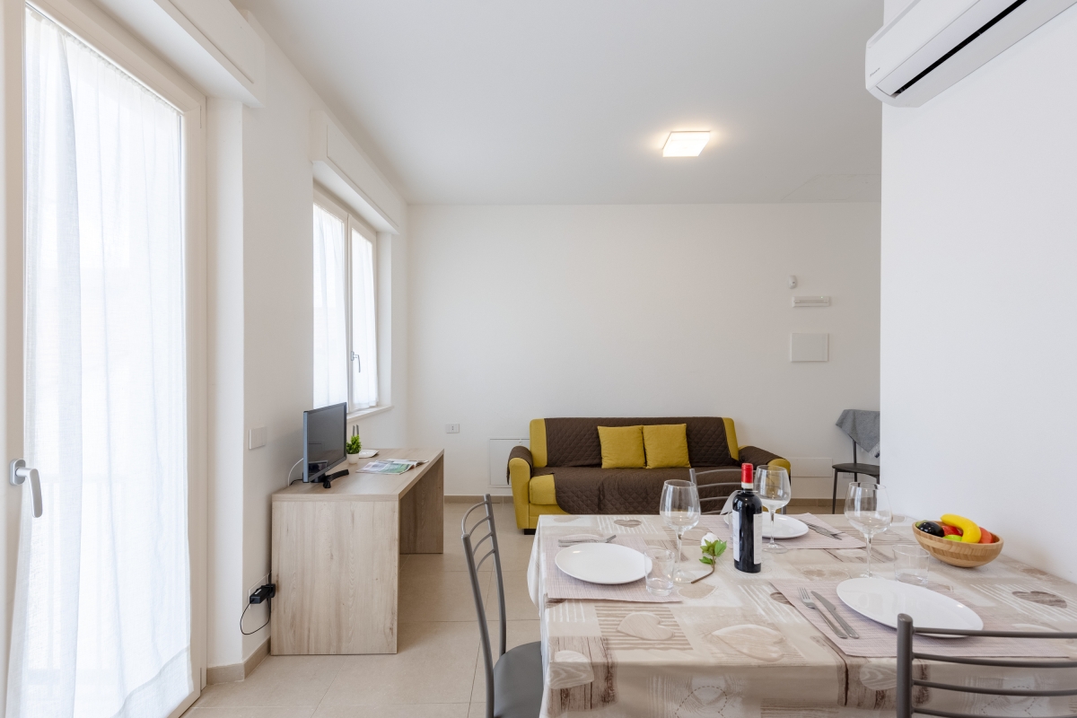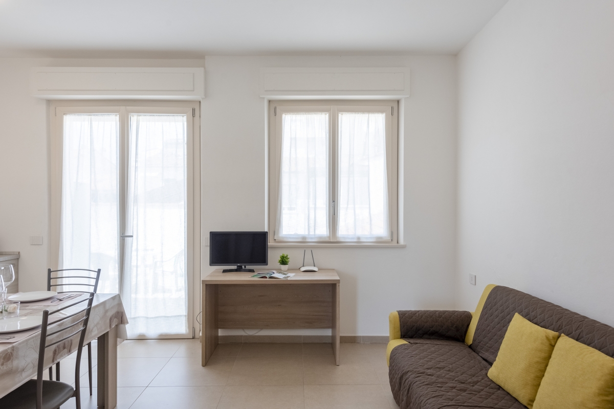 The one-bedroom apartment on the second floor is suitably furnished for a pleasant stay. It has a small terrace from the living room where guests can enjoy the weather and the sun. Inside the apartment, the living room is furnished with a single sofa bed, a kitchen-diner and a digital TV. The brand new kitchen is equipped with a Dolcegusto coffee machine, an oven and a fridge.