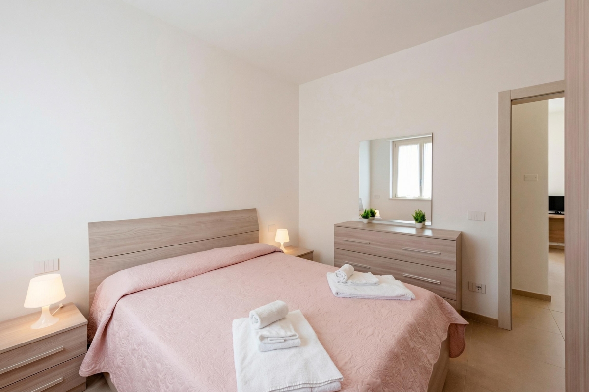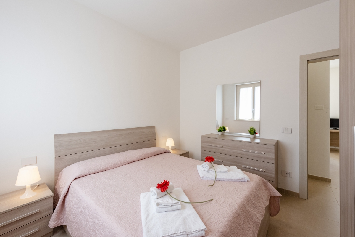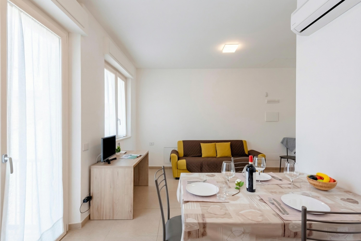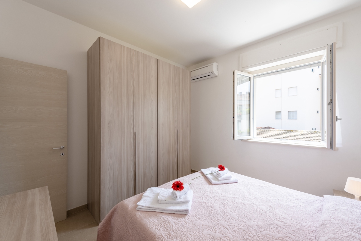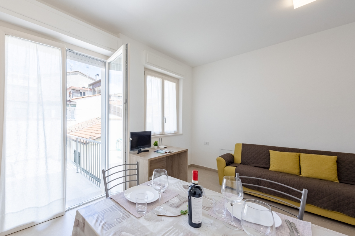 The one-bedroom apartment on the second floor is suitably furnished for a pleasant stay. It has a small terrace from the living room where guests can enjoy the weather and the sun. Inside the apartment, the living room is furnished with a single sofa bed, a kitchen-diner and a digital TV. The brand new kitchen is equipped with a Dolcegusto coffee machine, an oven and a fridge.