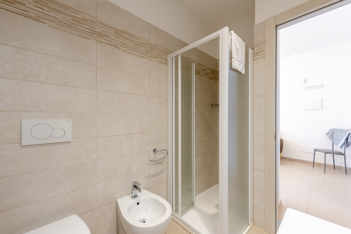 The modern bathroom has new fittings that include a spacious shower cubicle, a bidet and a WC.