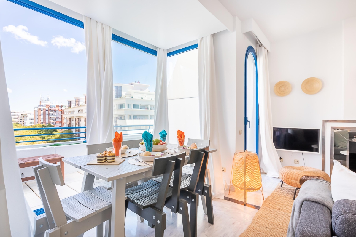 Situated close to the Marbella centre as well as the coastline, this flexible apartment for 4 conjures the absolute vacation atmosphere. The penthouse is in a fully-secured and gated apartment complex with Mediterranean-style communal gardens and a shared swimming pool to unwind on-site with friends and family.