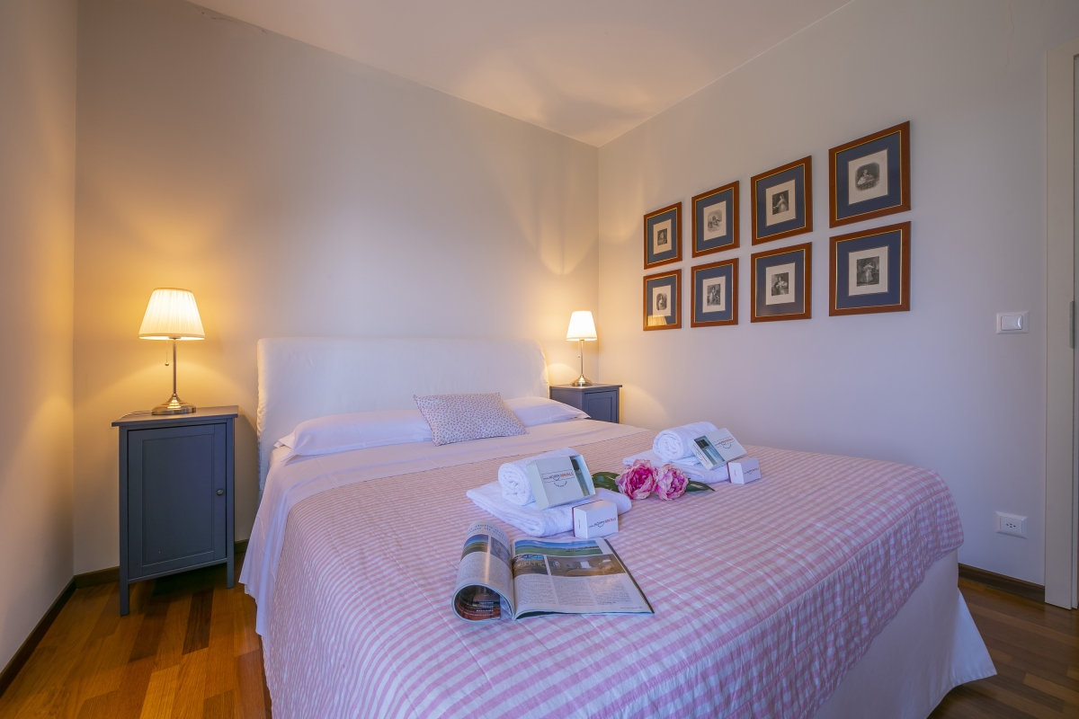 Bedroom 2: A fresh bedroom with a double bed, a traditional wooden wardrobe and a glass door out onto the balcony with views out over the lake.