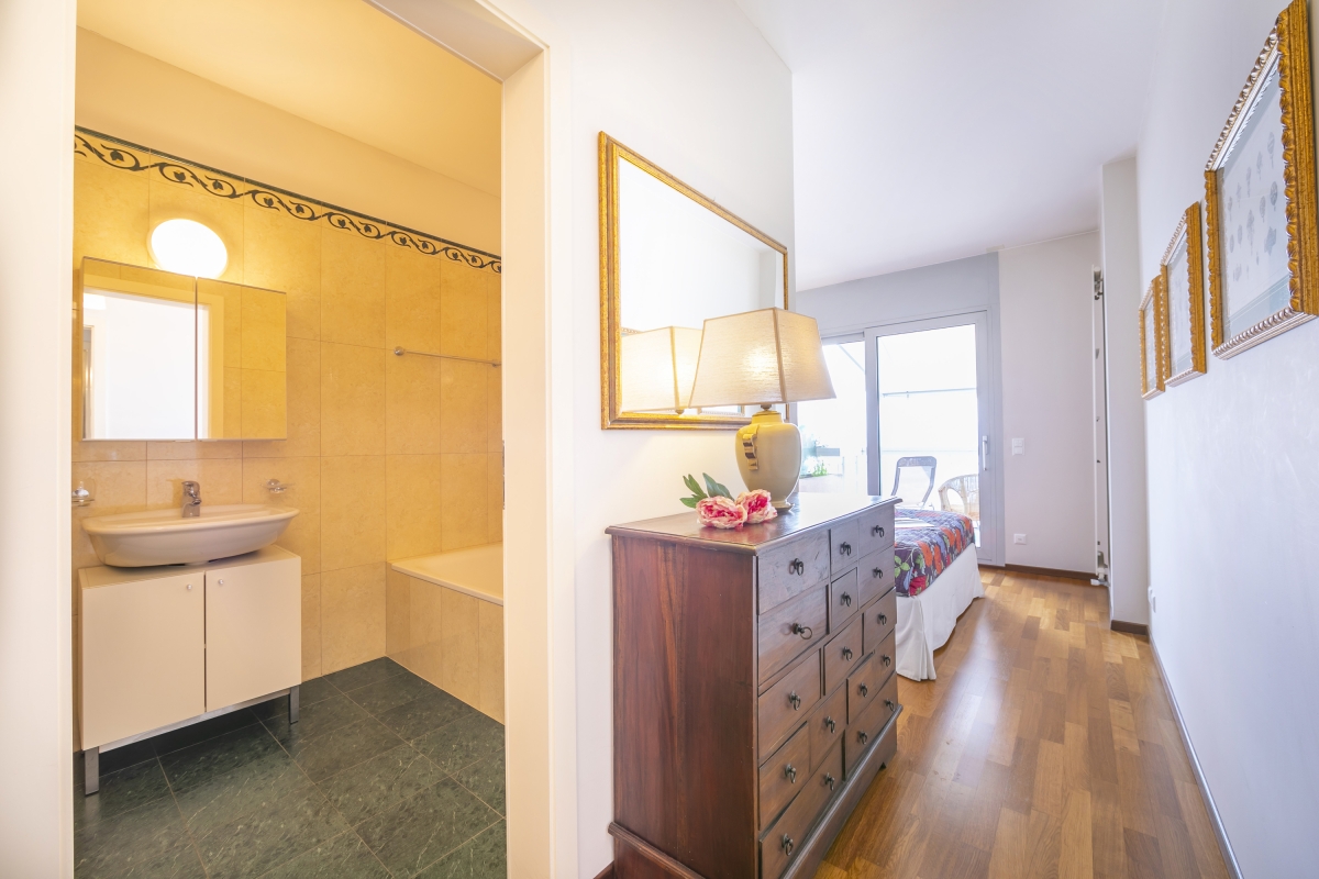 The three-bedroom apartment sleeps 6 people and is ideal for families. The light-filled corner living/dining room has two glass doors which lead onto the front balcony, where guests can relax on the sun loungers or dine al fresco and the side balcony, with views over the hills. Back indoors in the living room, there are two comfortable sofas, an armchair, a beautiful dark wood coffee table and a side-cupboard plus a widescreen satellite TV. The smart wooden dining table seats 4.