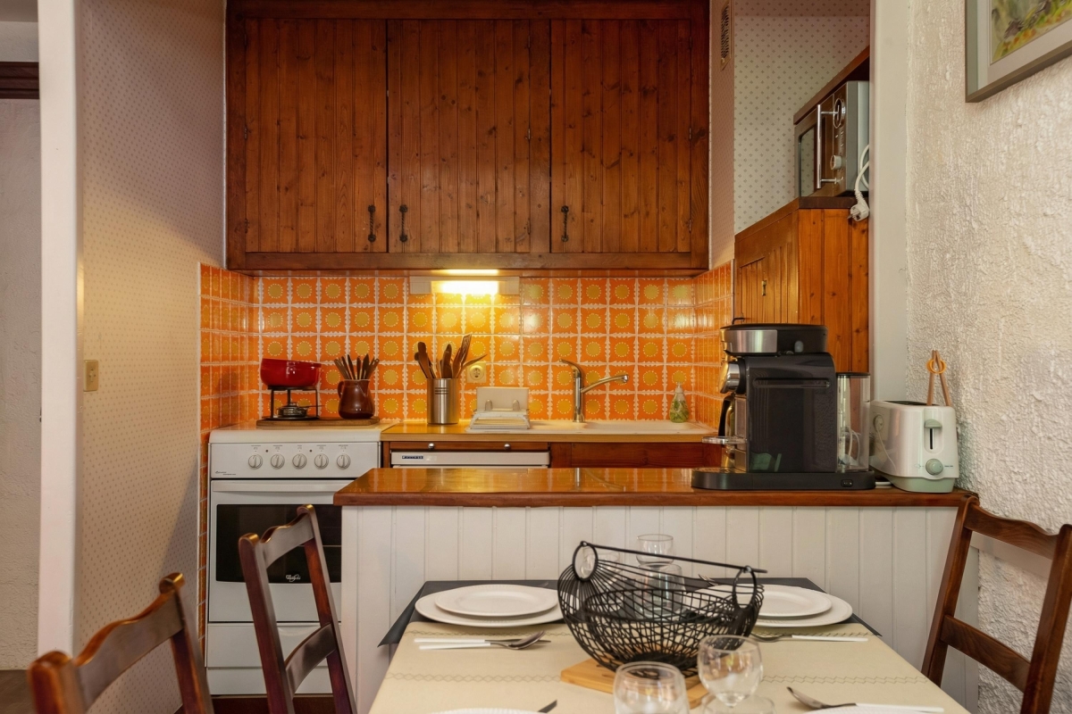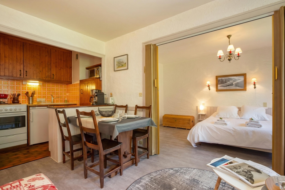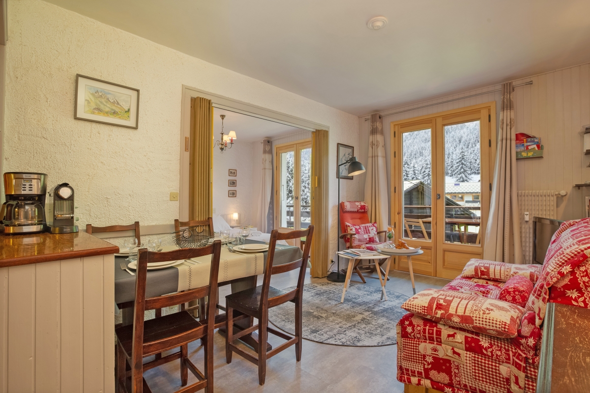 The cosy apartment, which sleeps 4 people, is well laid out, with two spacious rooms, both with French windows out onto a large balcony. The balcony has a table and chairs so you can relax and enjoy the beautiful mountain views. The sitting room has a comfortable sofa and rocking chair, with a coffee table and flatscreen satellite TV. At the other end of the room, there is a fully-equipped kitchen with a cooker hob, oven, microwave, fridge, freezer, coffee machine, raclette and fondue. The wooden table, with 4 chairs is right next to the kitchen for easy dining.