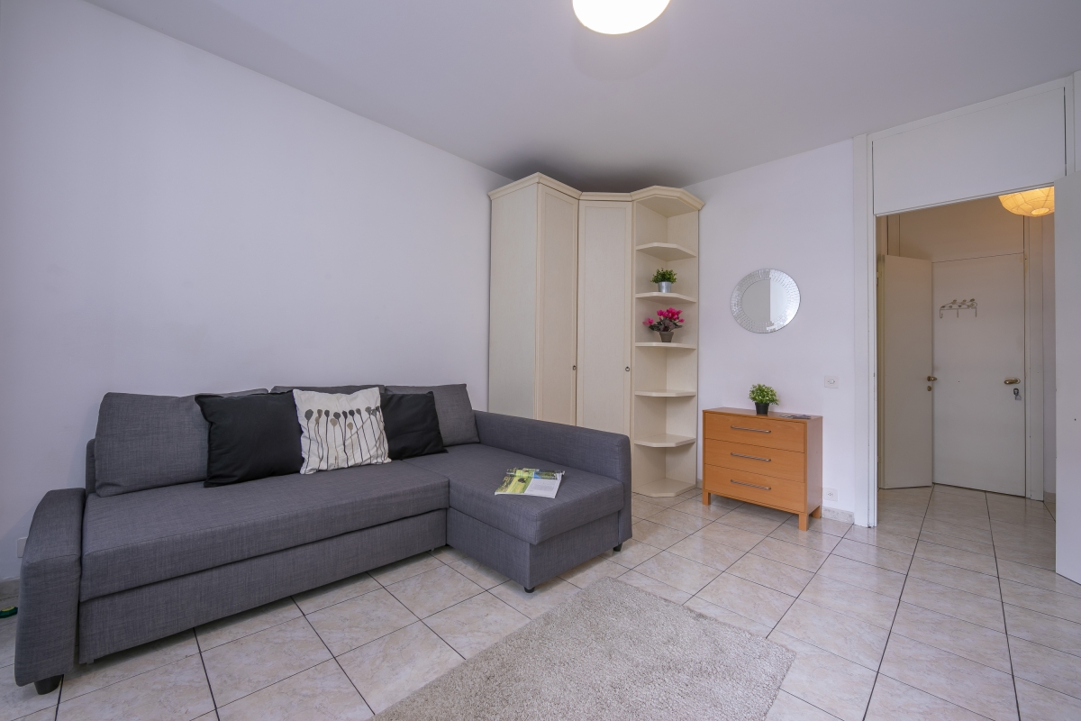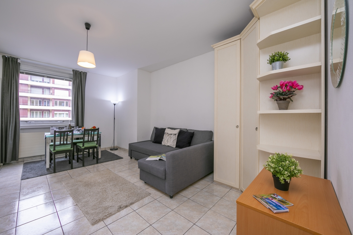 The modern apartment on the third floor of a seven-storey building with lift facility has the necessary amenities for a restful stay. It has a double sofa bed and a single bed and a dining table by the window. The kitchen is separate and well equipped with an oven, a fridge and a Nespresso coffee machine.