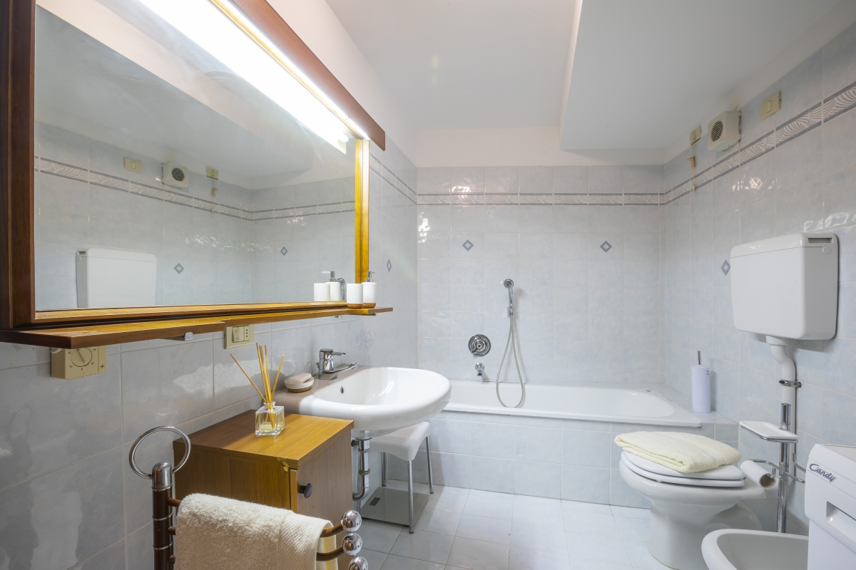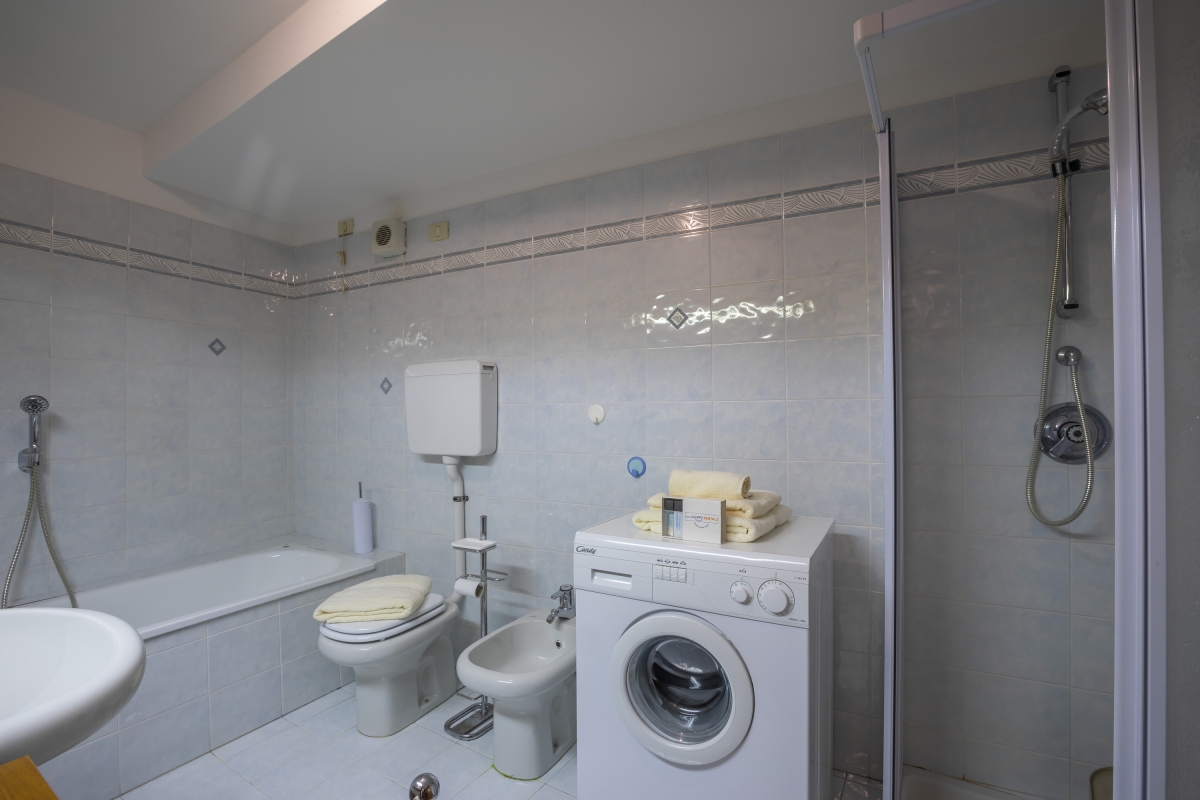 Bathroom 1: The large, well-illumined and fully-tiled modern bathroom features a bath with a hand shower, WC, bidet and washing machine.