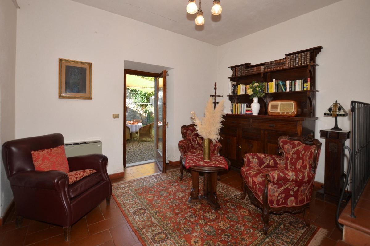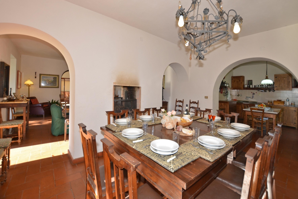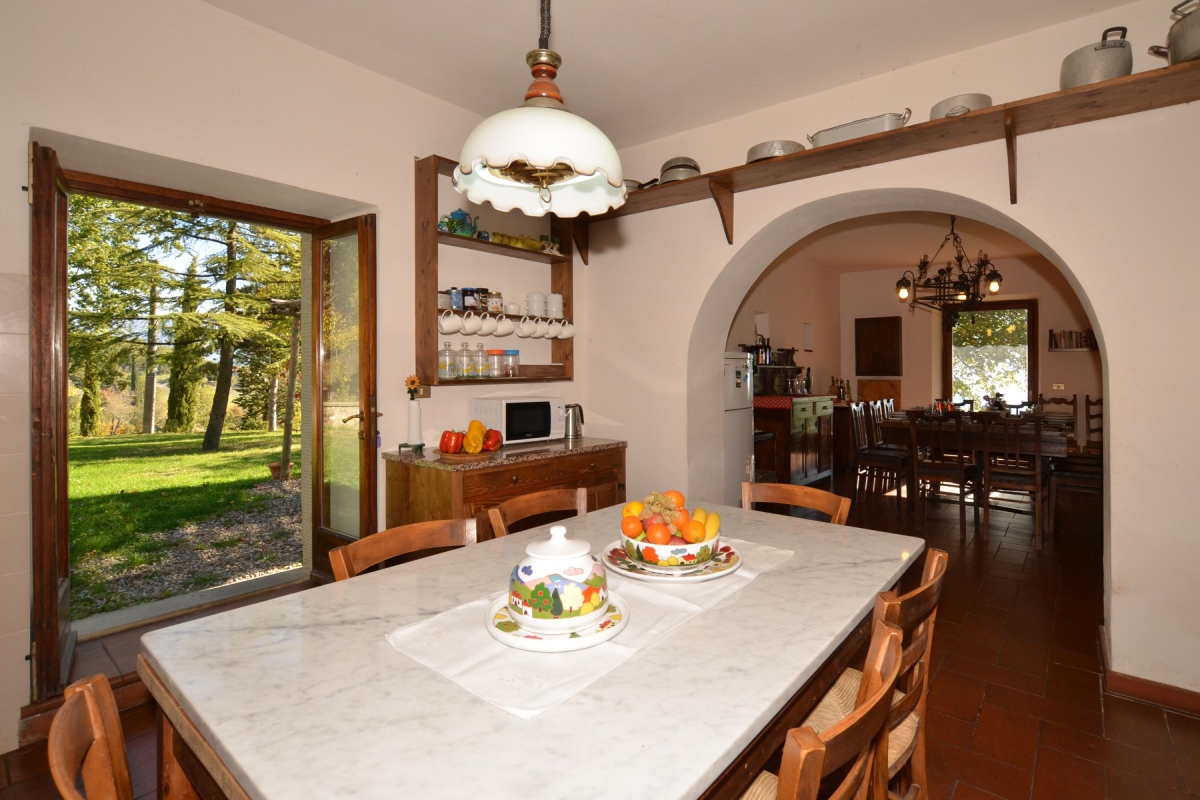 The kitchen can be reached through a typical Tuscan archway. Its traditional wooden cupboards and terracotta tiled floors keep it cool in summer and cosy in winter. There are attractive double glass doors leading directly to the garden. It is fully equipped with everything guests will need. There is a cooker hob, oven, microwave, dishwasher, fridge, freezer, and drip coffee machine.