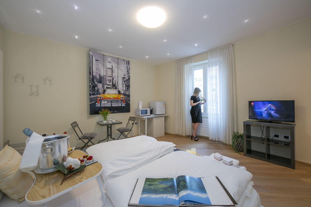 The suite has a well-equipped refreshment corner, with kitchen appliances like a Nespresso machine, microwave, fridge, freezer and electric kettle at your disposal. A really big wardrobe is also available and is perfect to store up your belongings if you plan to enjoy a long holiday on Lake Garda.