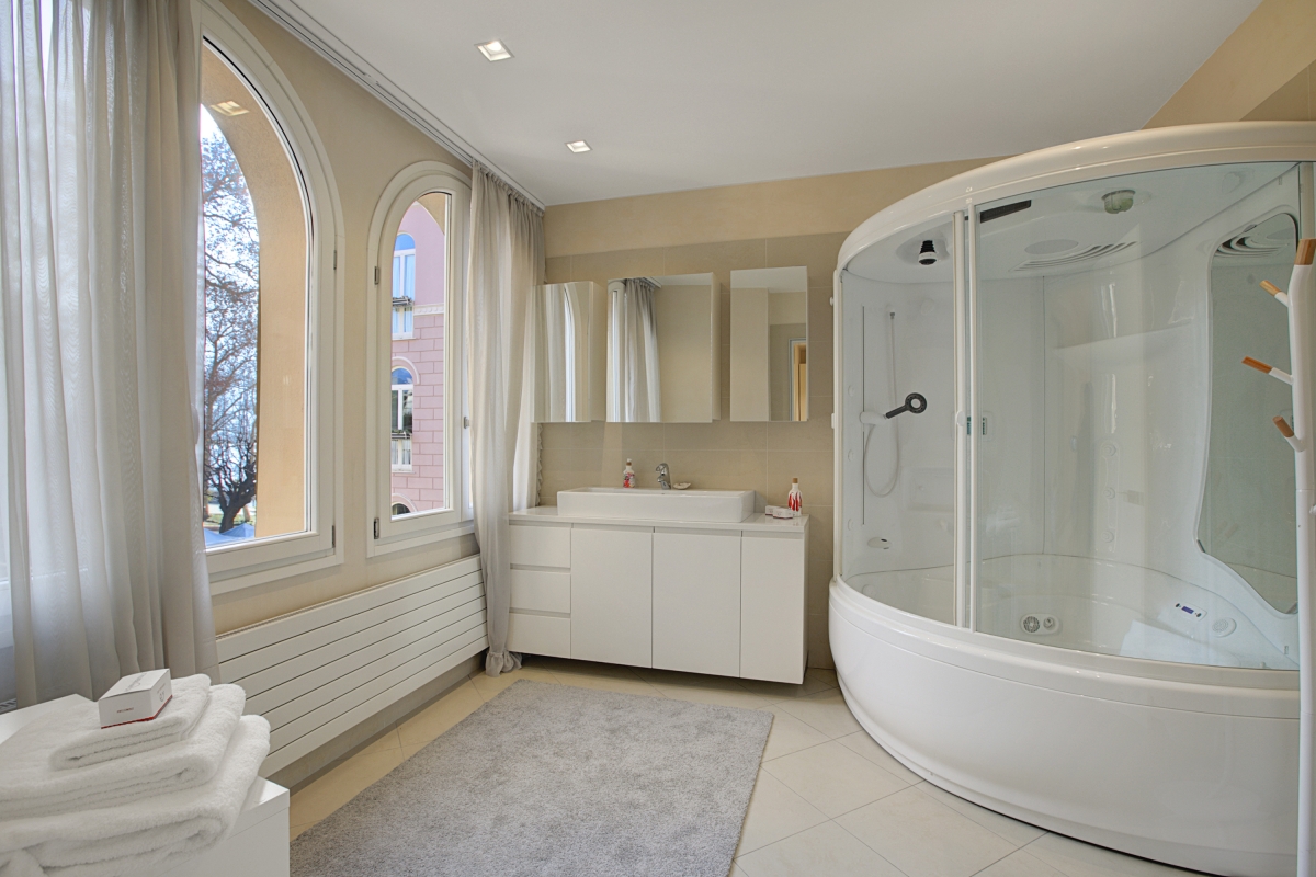Bathroom 1: The super spacious and plush bathroom has a Jacuzzi with sauna, WC, and bidet.