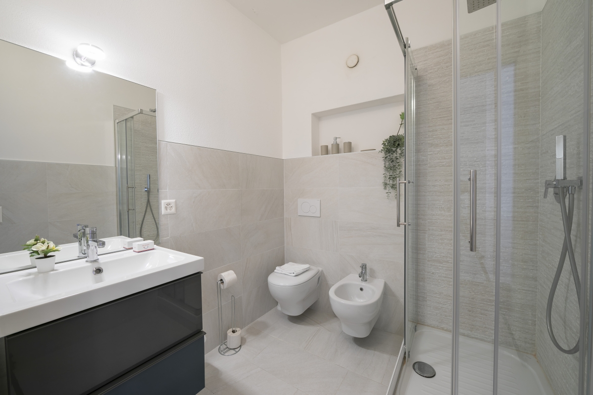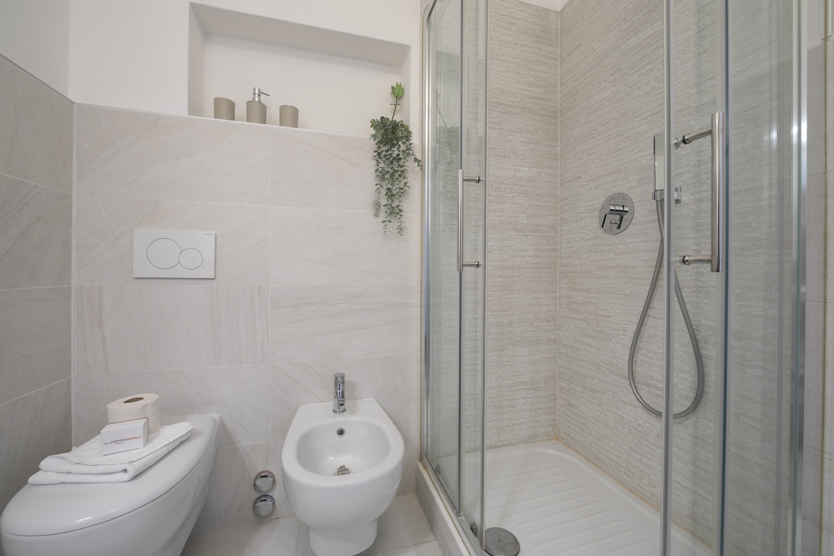 The modern bathroom is fully furnished and has a shower, washbasin WC and bidet.