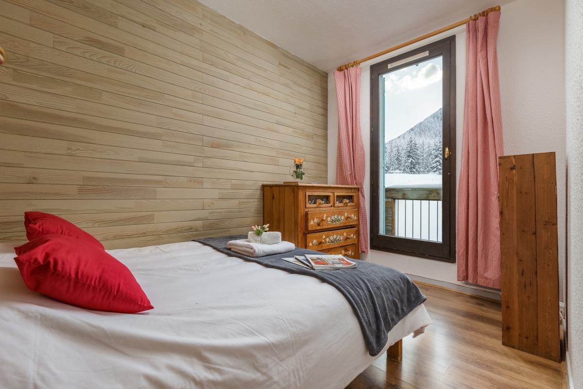 Bedroom 1: A mountain-view master bedroom with a double bed, balcony access and wardrobe.