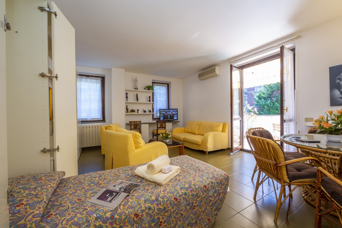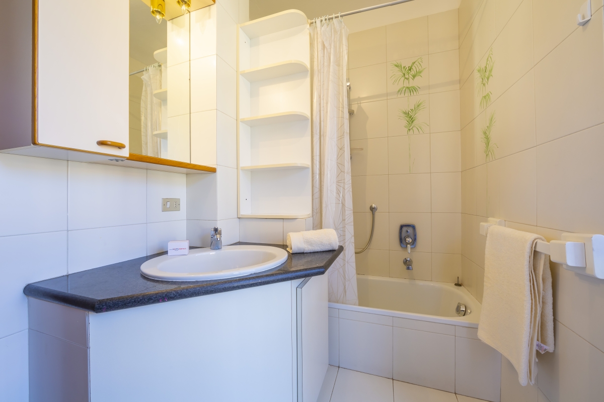 The living room of the apartment is an ideal family space with terrace access, ample seating, a digital flat-screen TV and a dining table that will seat everyone comfortably, just the way it is at home. The kitchen of the apartment is also fully-equipped to ensure a hassle-free stay and carefree meals any time of the day; there is a dishwasher, Mokka coffee machine, microwave and a fridge at guests' disposal. A little breakfast table further completes the layout of the big and modern kitchen.