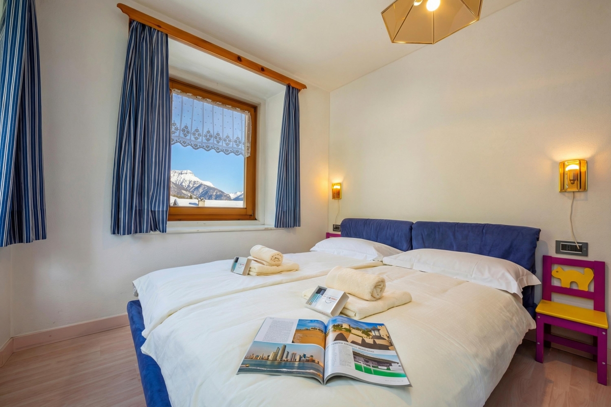Bedroom 1: A bright, corner room with 2 joined single beds, a Smart TV and large French windows, leading out to a private balcony with stunning mountain views.