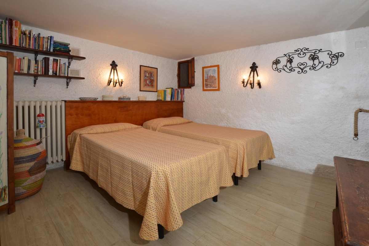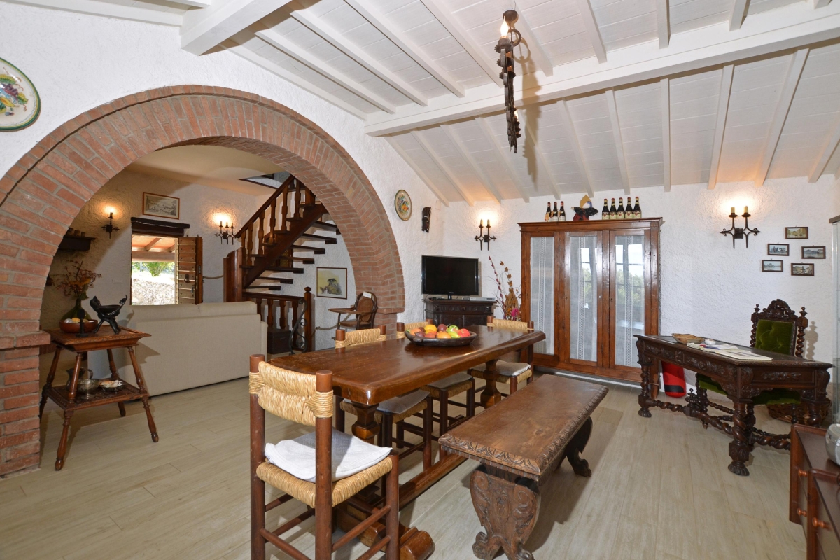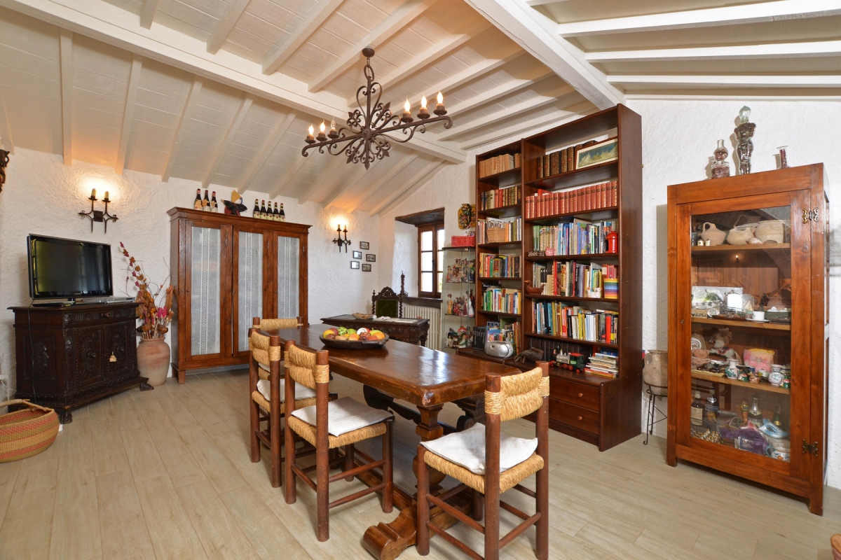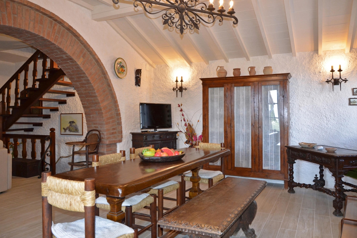 The spacious living room, on the raised ground floor, has a comfortable sofa and armchair. A traditional brick arch leads from the living room to the dining room with its painted wooden ceilings and bookcases. The wooden dining table seats 6. The newly renovated kitchen, with rustic tiling and wooden cupboards, is just off the dining room and is fully equipped with a cooker hob, oven, microwave, dishwasher, fridge, freezer and drip coffee machine.