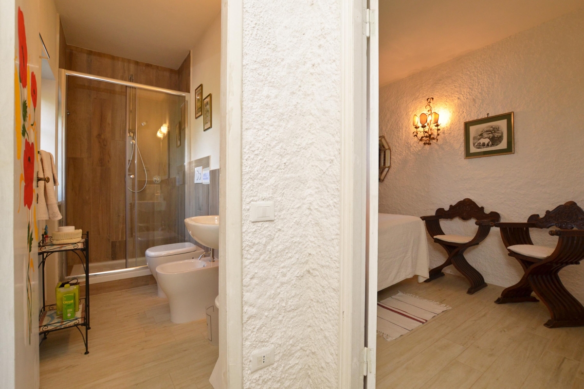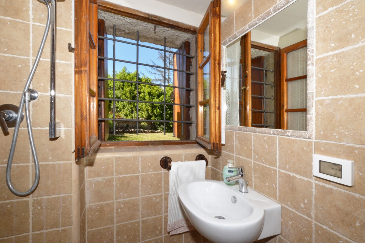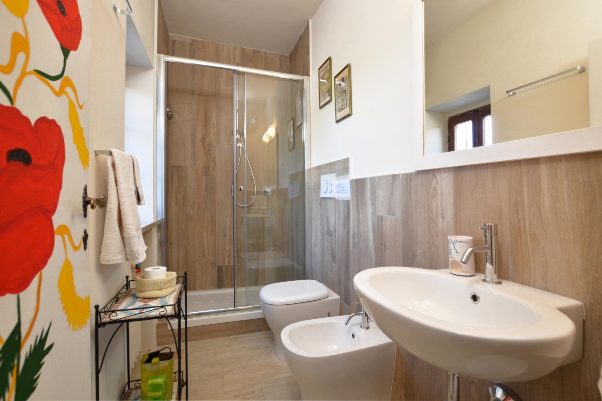 Bathroom 2: En suite with the second bedroom, this shower room is tiled with traditional Tuscan stone tiles. It is fitted with a shower, a washbasin and a WC.
