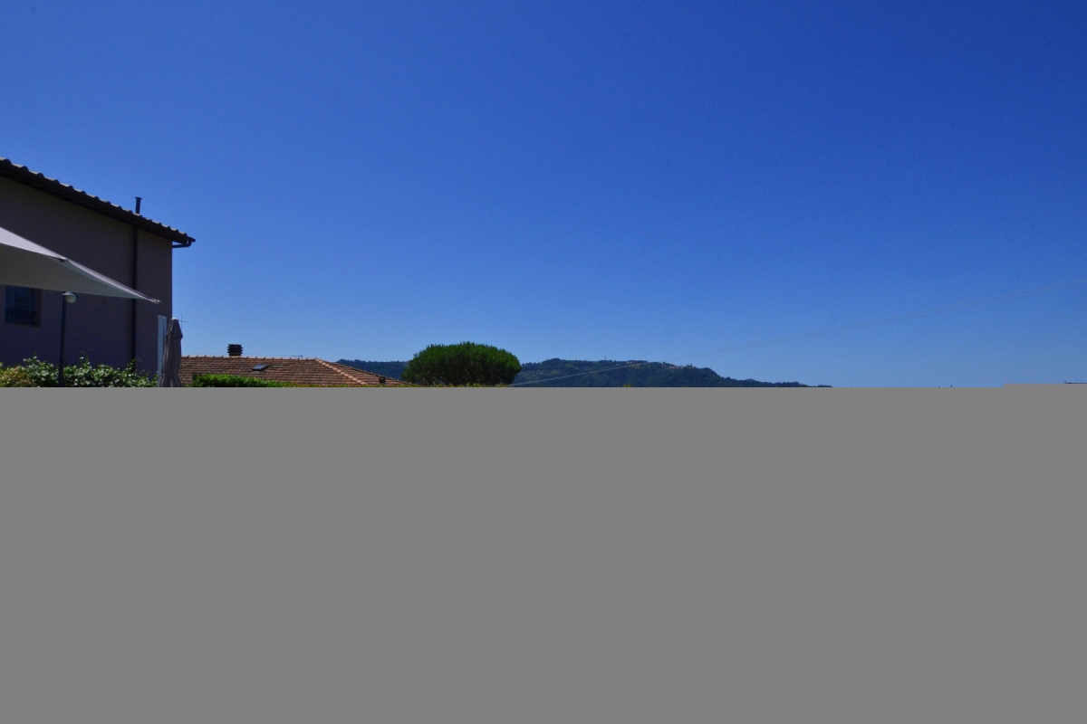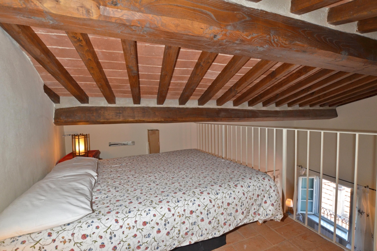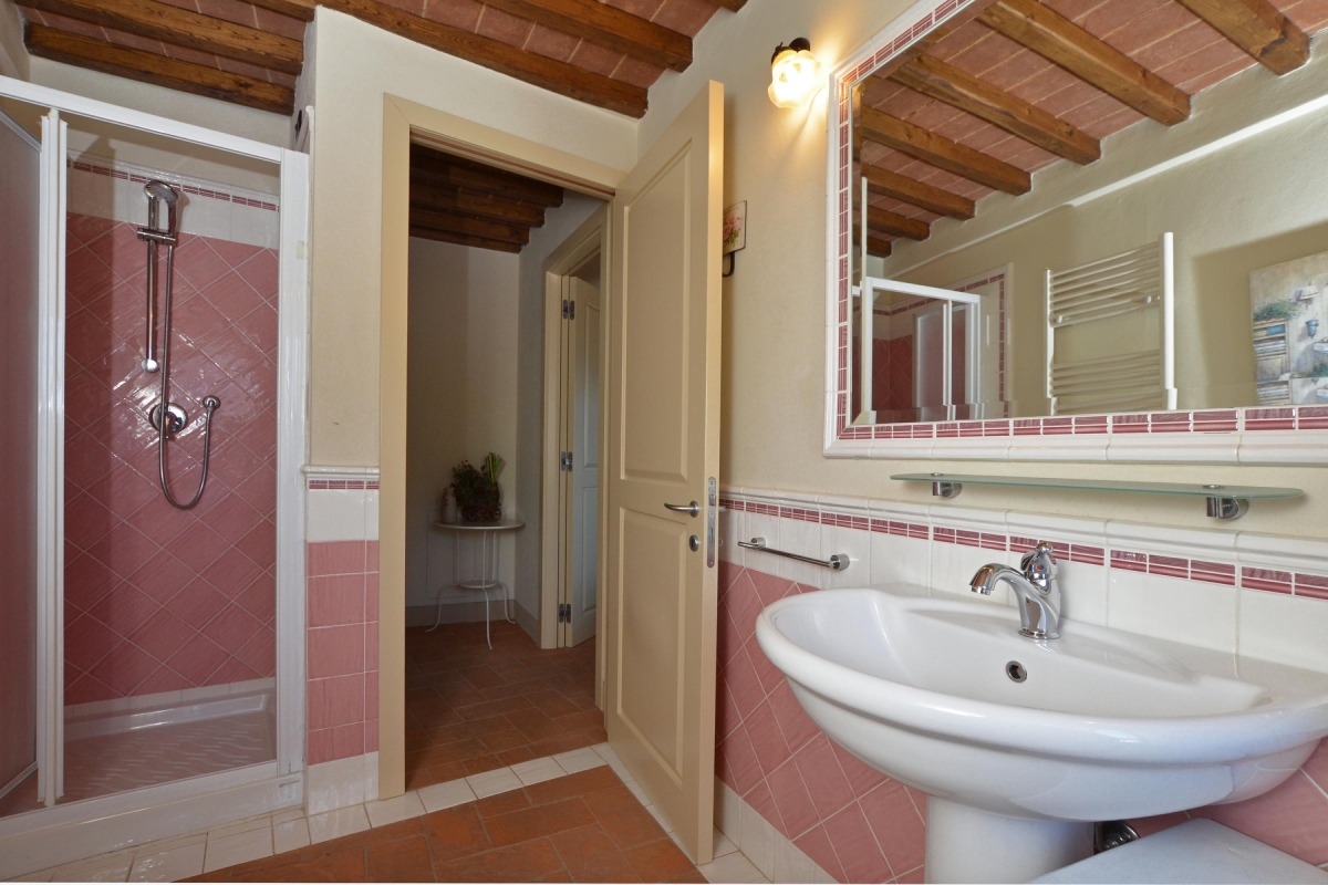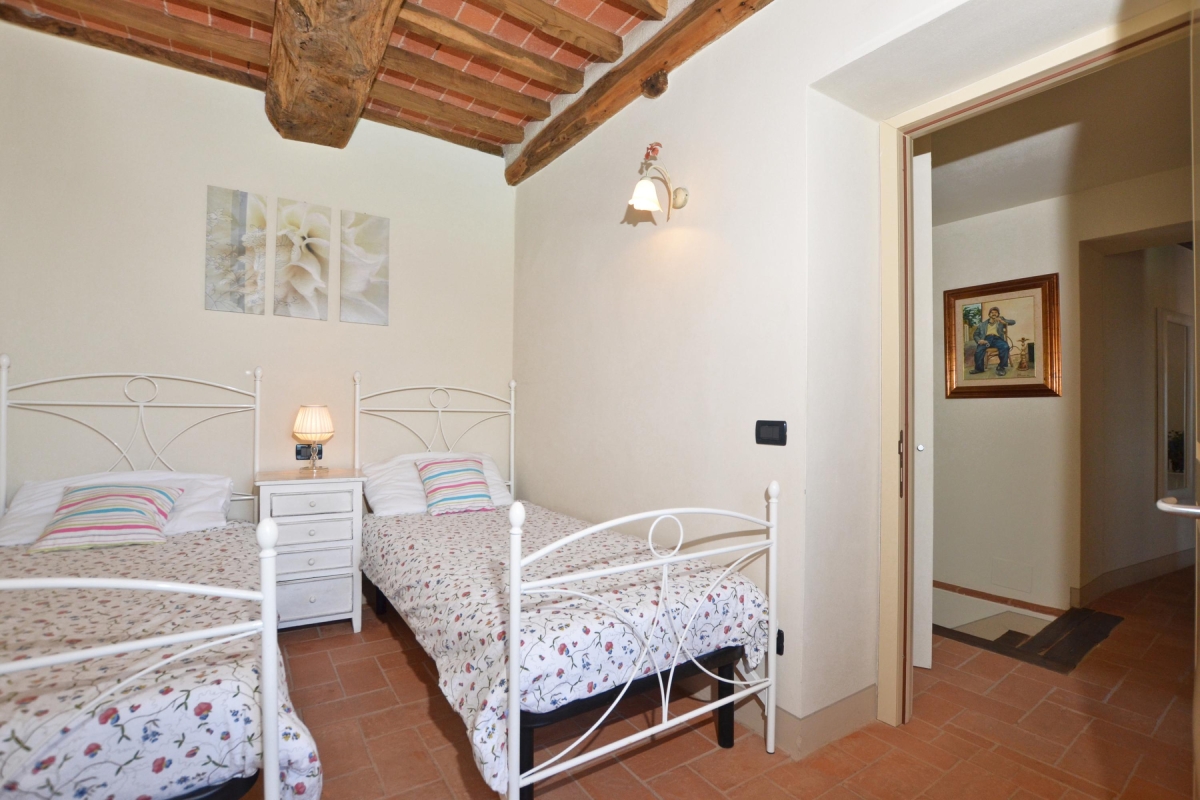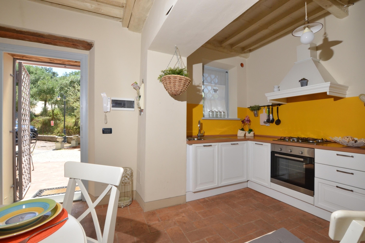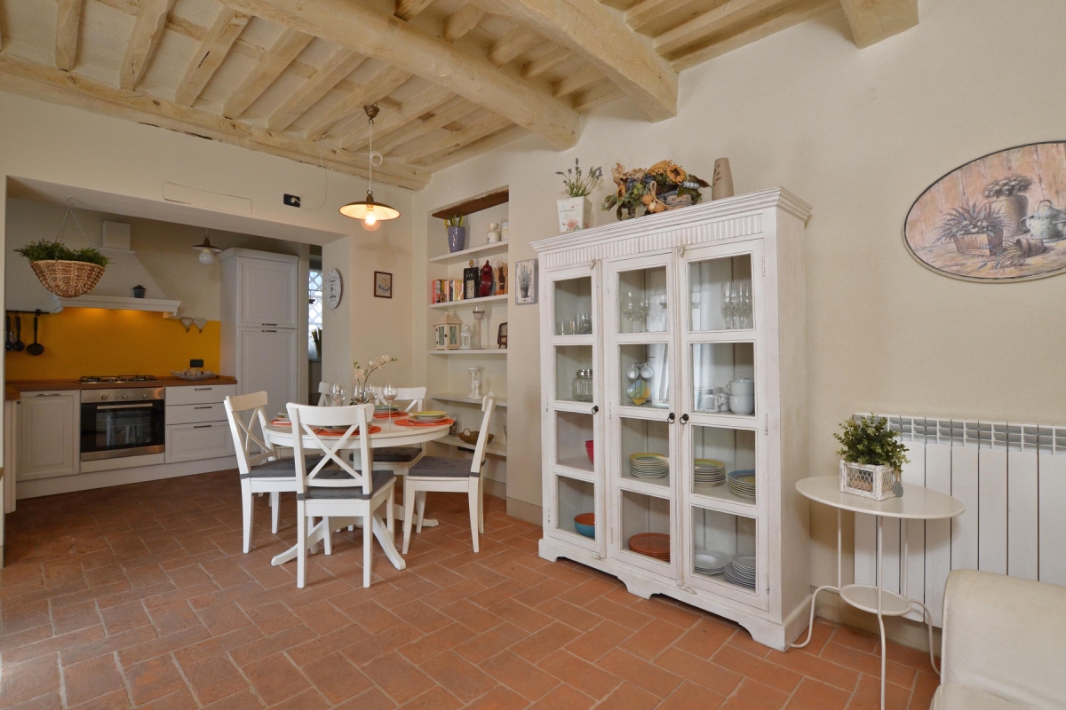 The apartment is spread over 2 floors and a further gallery opens up over the double bedroom. It can sleep up to 6 people in comfort. Most of the rooms have absolutely stunning views out over the Tuscan hills. The living area, dining room and open-plan kitchen are on the ground floor, with a door opening directly onto the garden and terrace. The interiors are sensitively restored with pale beamed ceilings and terracotta floors. There is a sofa with a flat-screen TV and a round dining table for 6 people. The open plan kitchen is well equipped with a cooker hob, drip coffee machine, microwave, oven, dishwasher and fridge-freezer.