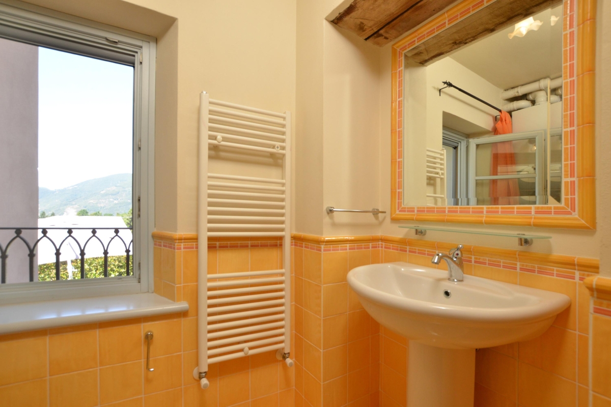 Bathroom 2: A sunny, yellow-tiled bathroom with a basin, bidet and WC.