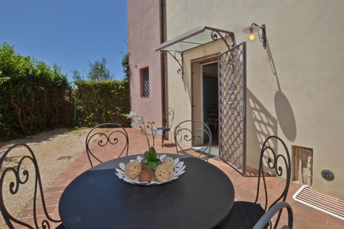Outside there is a paved terrace with an elegant wrought iron table and chairs, shaded by and large parasol. Here guests can dine al fresco.