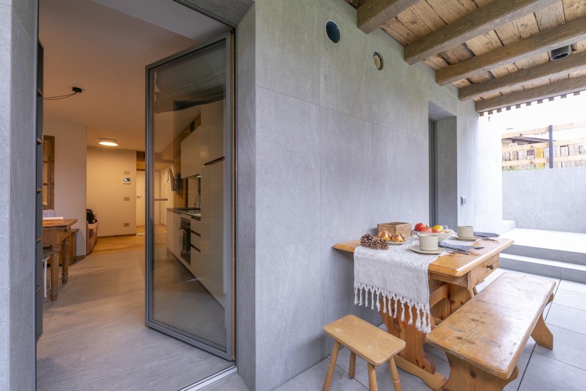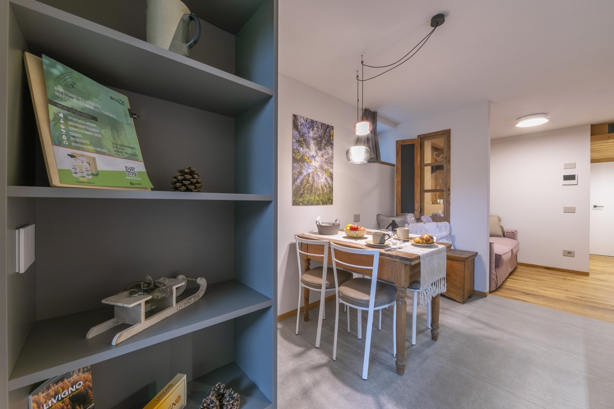 This residence is in a quiet but central part of Livigno. It is close to the ski slopes and the shuttle bus stop. There is private parking outside the building but a car is not essential.
