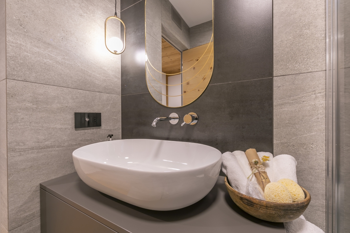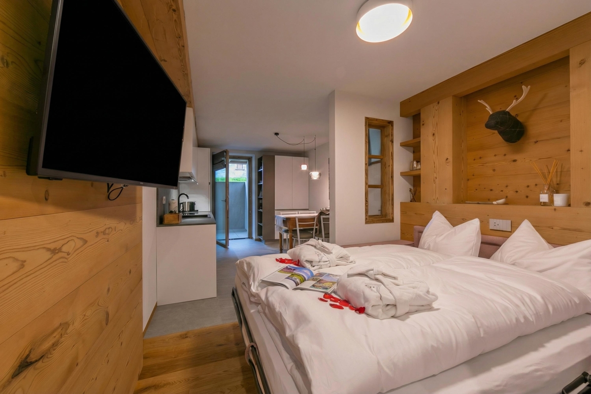 On the lower ground floor of an exclusive apartment block, this beautiful, cleverly designed, apartment includes everything a couple might need for the perfect holiday at any time of year. The studio apartment has cosy living room next to the open plan kitchen/dining area. The living room includes a large, Smart TV and a stylish sofa.