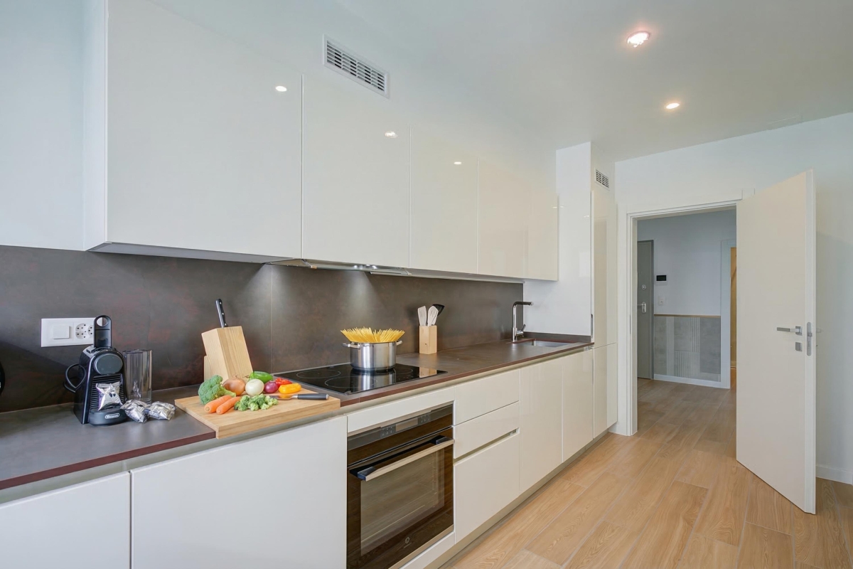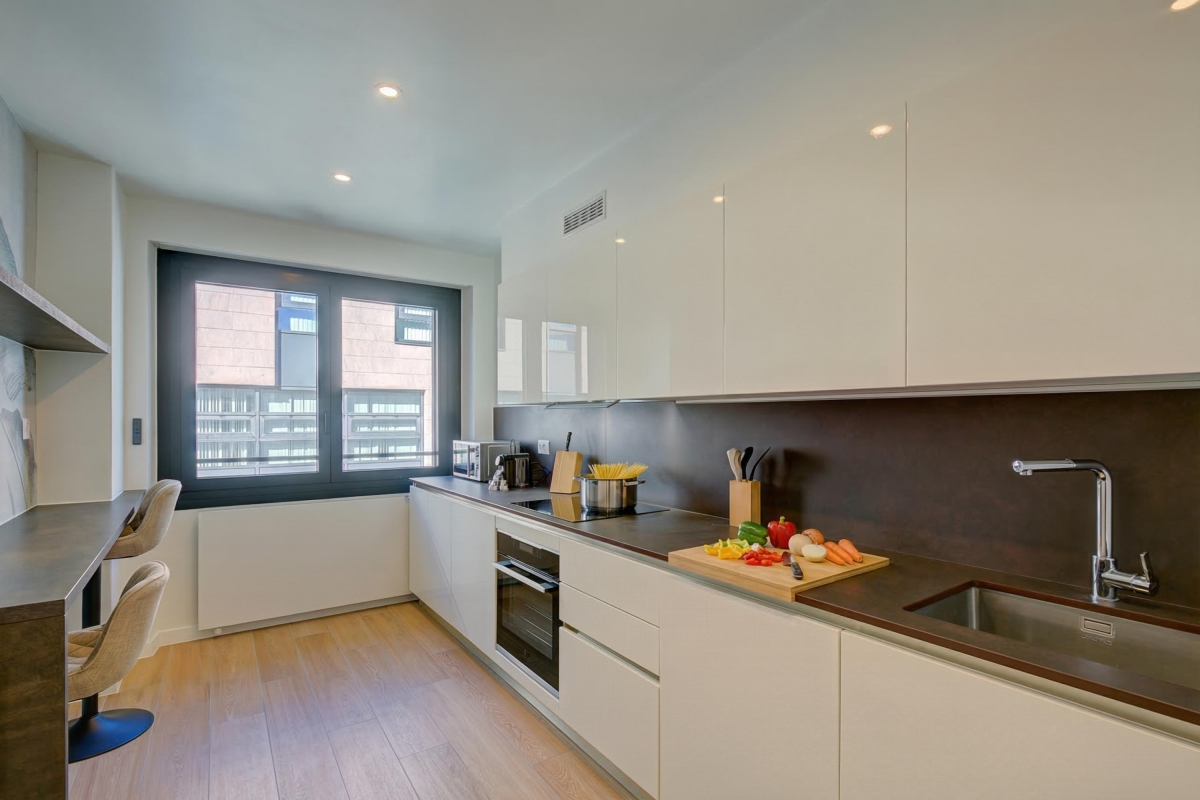The fully-equipped, fitted, kitchen has everything you might need for your stay: an induction hob, oven, microwave, dishwasher, fridge, freezer and even a Nespresso machine. A large glass door leads out onto another balcony.