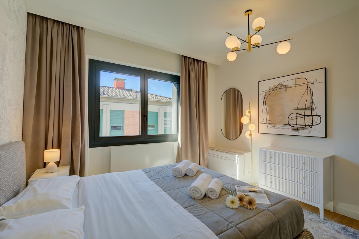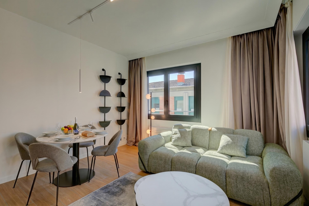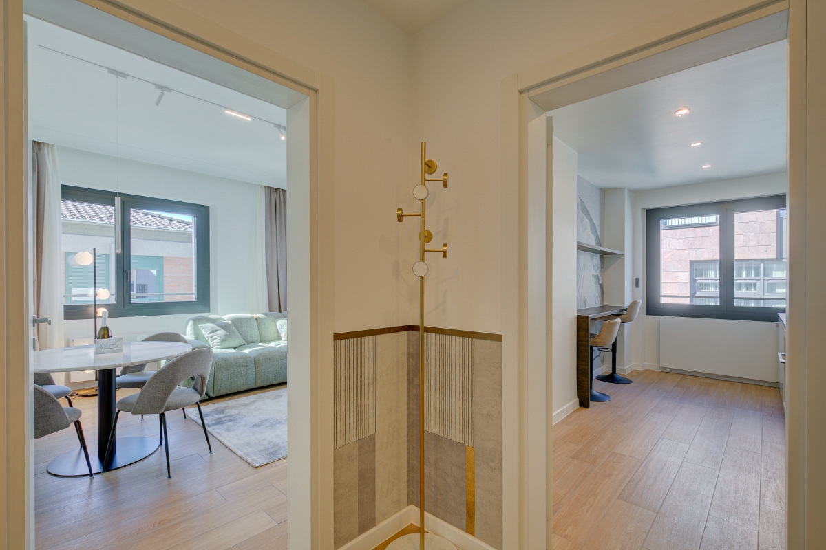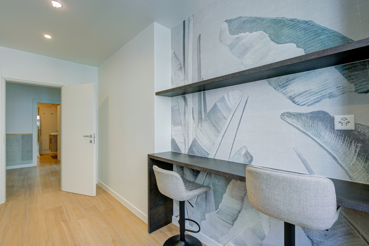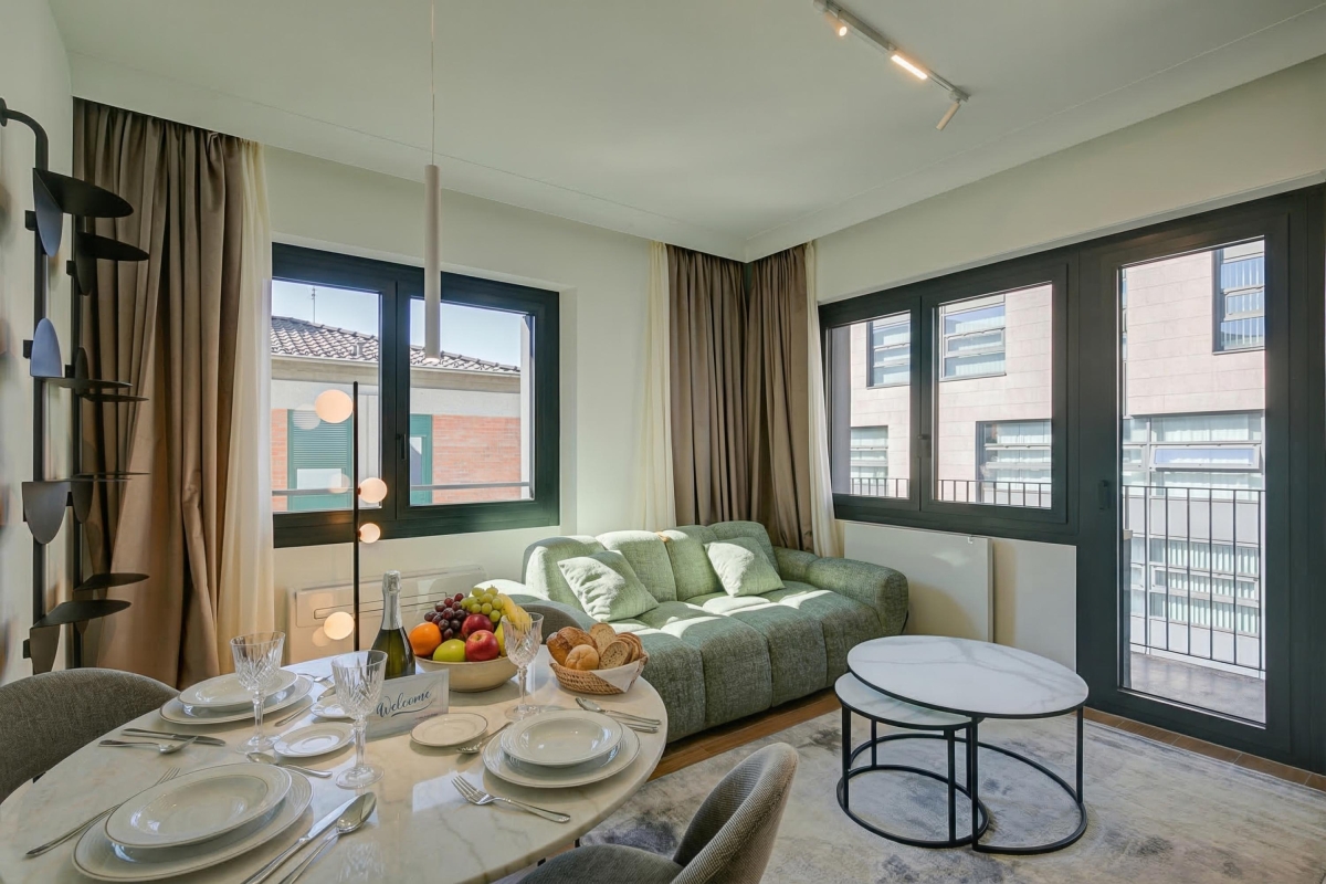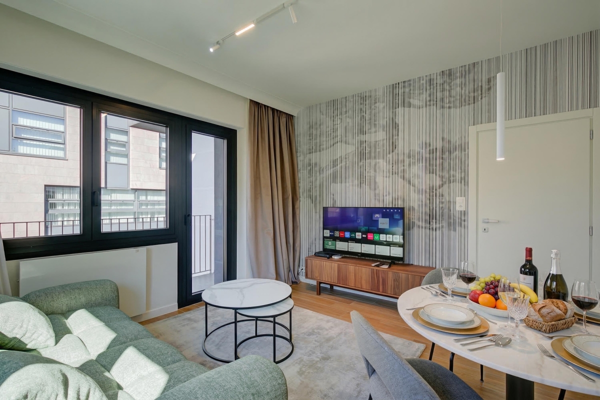 The rooms all lead off a spacious entrance hallway. The bright living room is on the corner of the building, so has large windows on two sides plus a glass door, leading onto a balcony overlooking the street. There is a contemporary, leather-finish sofa (which converts into a double bed), a large Smart TV and a contemporary dining table with 4 chairs. It is an ideal space to relax with family or friends.