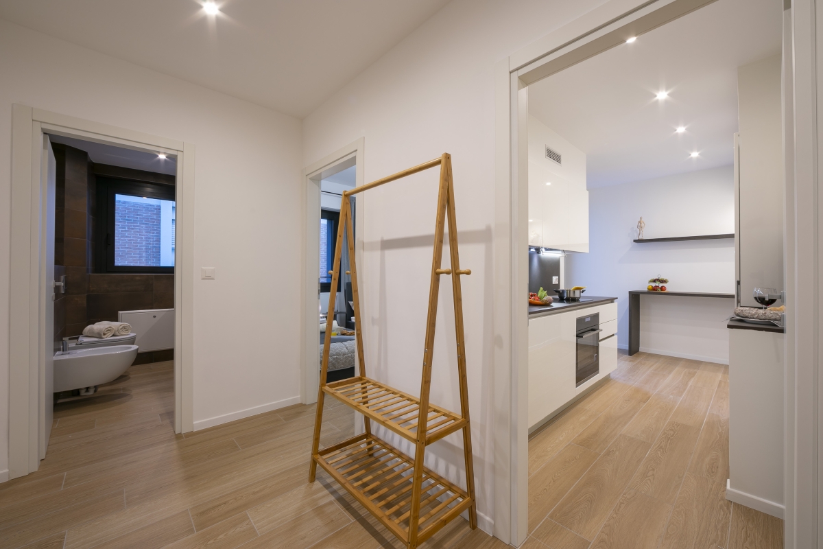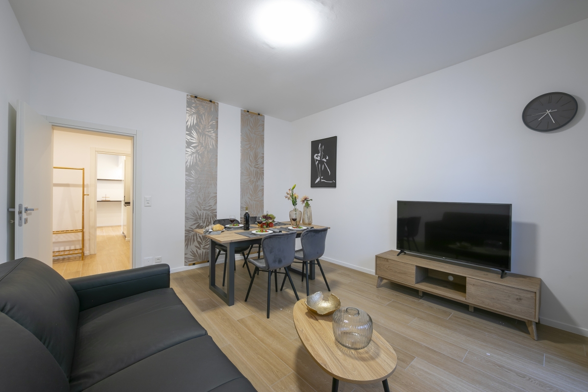 The wooden-floored, air-conditioned apartment is arranged around a spacious entrance hallway. The bright living room has a large window and a glass door, leading onto a balcony overlooking the street. There is a comfortable sofa (which converts into a double bed), a large Smart TV and a contemporary dining table with 4 chairs. It is an ideal space to relax with friends or family.